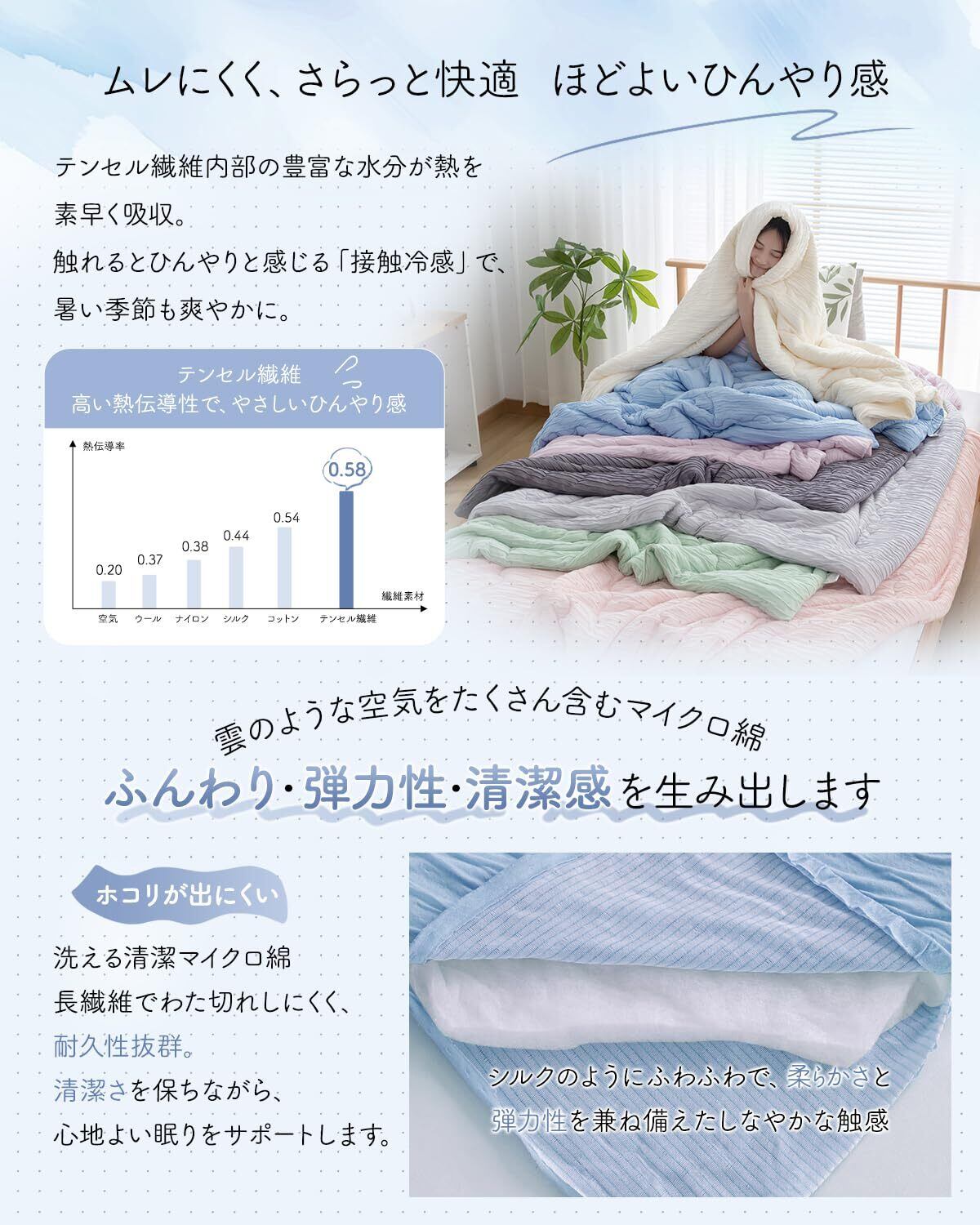 【高級テンセル繊維 マシュマロケット・商品仕様】「サイズ」140×190cm ※キルティング製(許容範囲+5%,-3%) 「素材」側生地:テンセル(上層)、ポリエステル97%、ポリウレタン3%(下層)中綿:マイクロ綿(ポリエステル100%)「企画国」日本【ご注意】お客様のご覧いただく環境により、色合いなどが異なる場合があります。実物とは色合いや明るさなどに相違が生じる可能性があるため、ご了承ください。万が一商品に不具合がある場合は、にご連絡いただければ迅速に対応いたしますので、ご安心してお買い求めください。