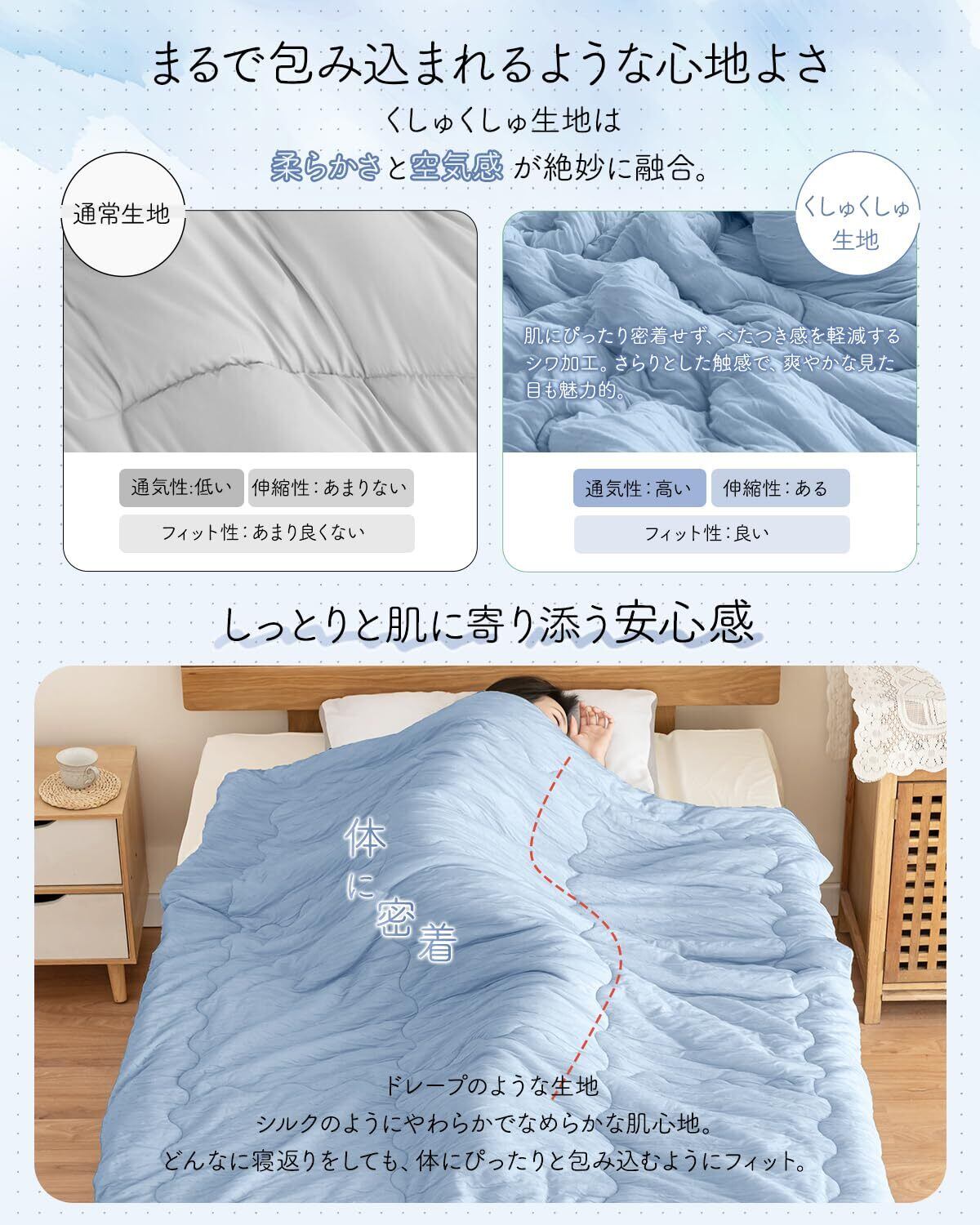 【超密着!くしゅくしゅ生地】シワ加工が肌へのべたつきを軽減し、さらりと心地よい触感を実現。シルクのような柔らかさとなめらかさで、見た目も爽やか。寝返りをしても体にしっかりフィットし、包み込まれるような安心感をお届けします。