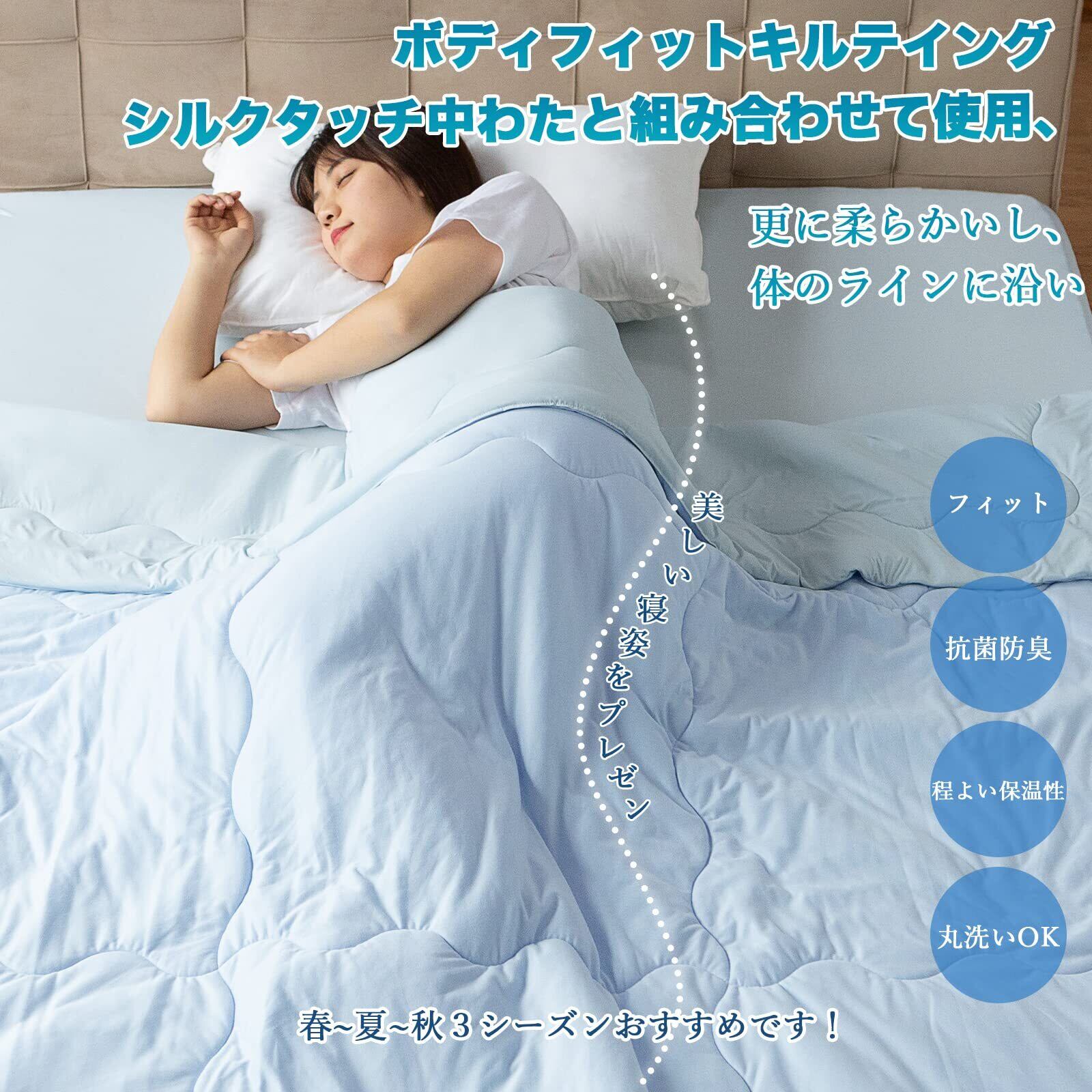 【フィットキルト】掛け布団はこだわりのボディフィットキルト仕様を使い、体のラインに沿いがよく、寝返しても体から滑り落ちてしない、優しく雲につつまれるように、朝まで涼しく安眠できます。