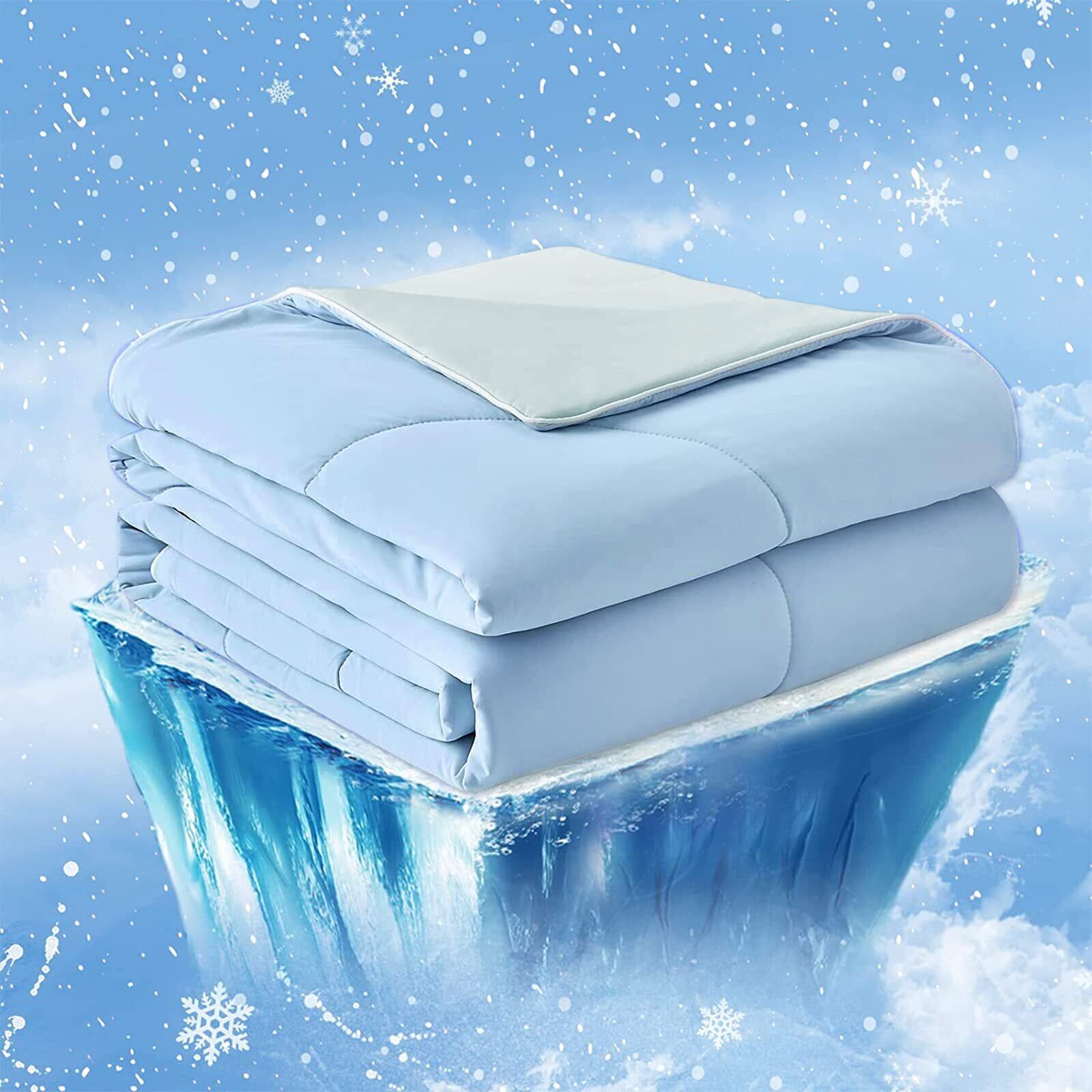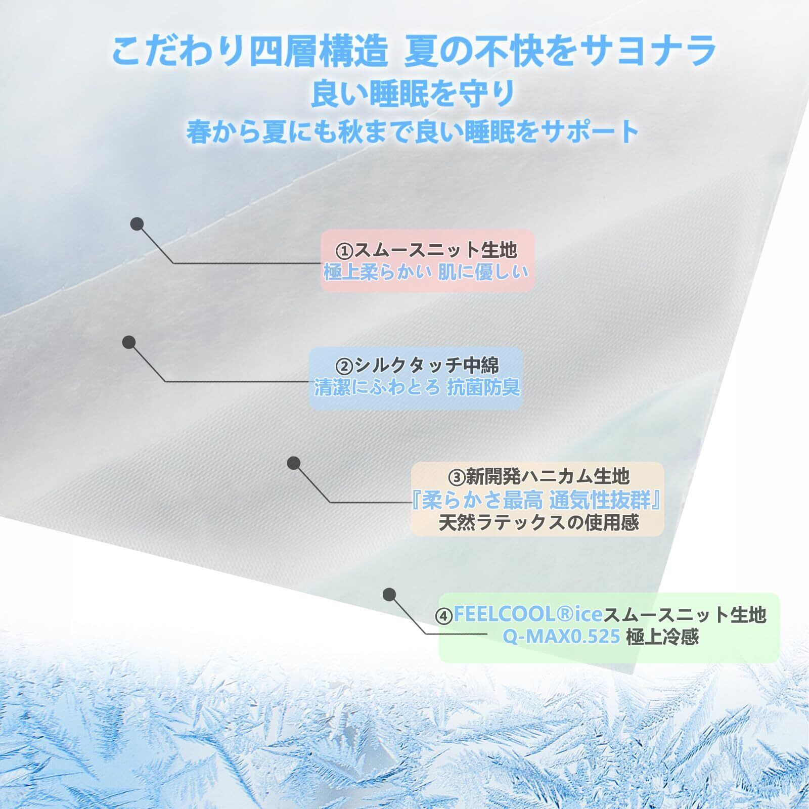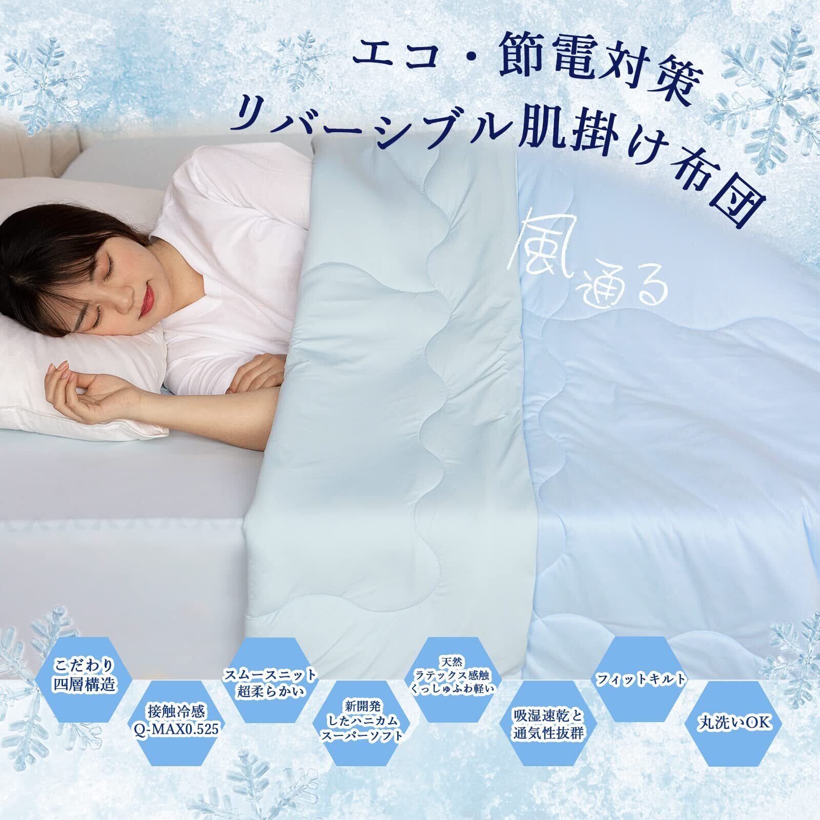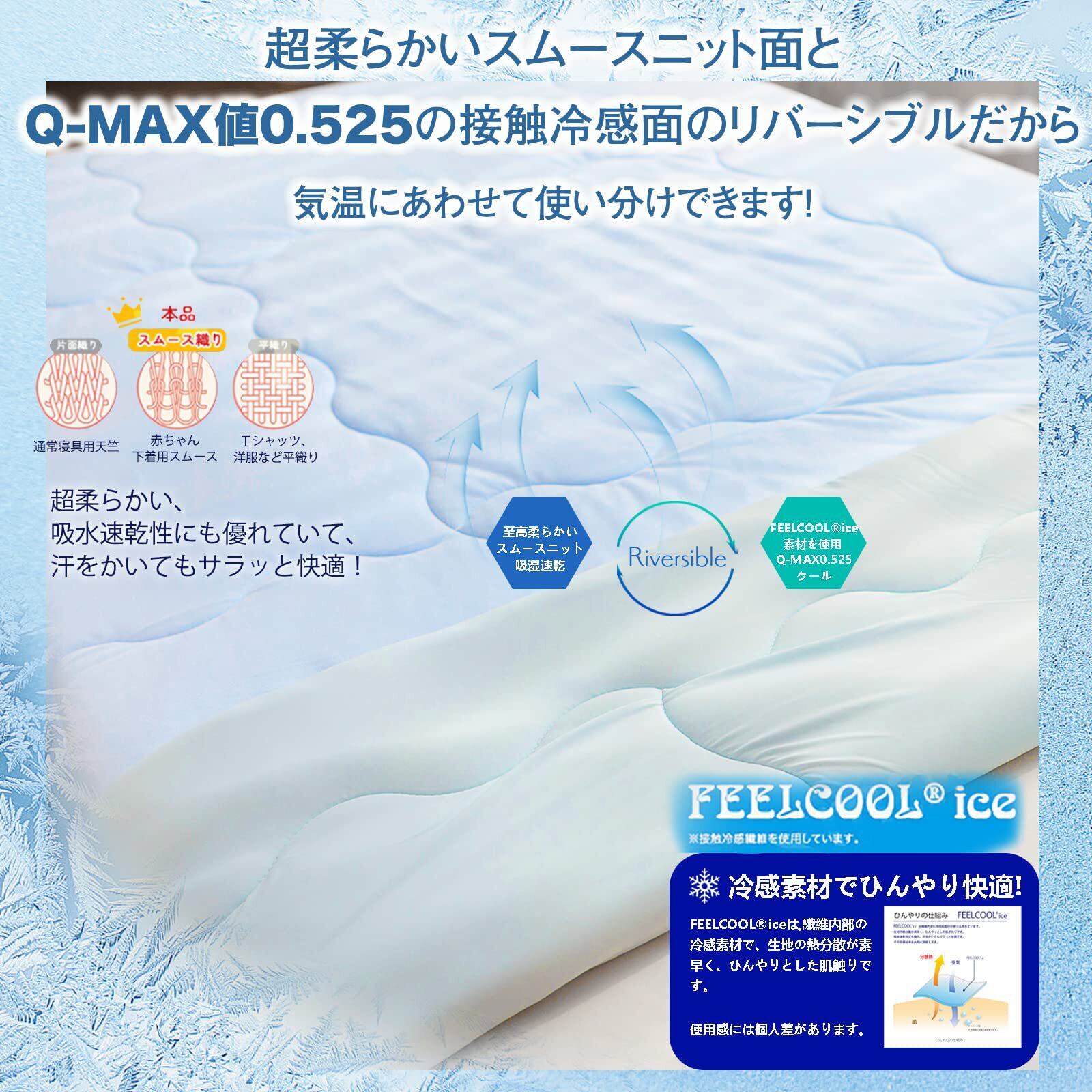 【極上冷感 Q-MAX 0.525】肌掛け布団のA面の生地はFeelCooliceの冷感繊維を使用、接触瞬間に冷たくひんやりと感じます。寝汗吸収発散が早い、サラサラ爽やか気持ちよいです。エアコンの使用時間を減らし、節電し、体にやさしいです。