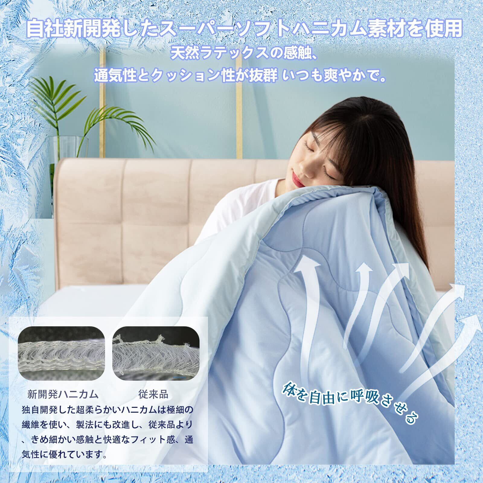 【4層構造 リバーシブル 通気】掛け布団はこだわり四層構造のデザインを採用:①層目:A面柔らか『冷感素材』ナイロンとポリウレタン混天竺。②層目:独自新開発『柔らかさ最高 通気性抜群』ハニカム、天然ラテックスのような使用感。③層目:ふわとろ抗菌防臭『シルクタッチ』中わた。④層目:『至高の柔らかさ』両面織りスムースニット。春、夏、秋を問わず、快適な睡眠体験をお届けします。