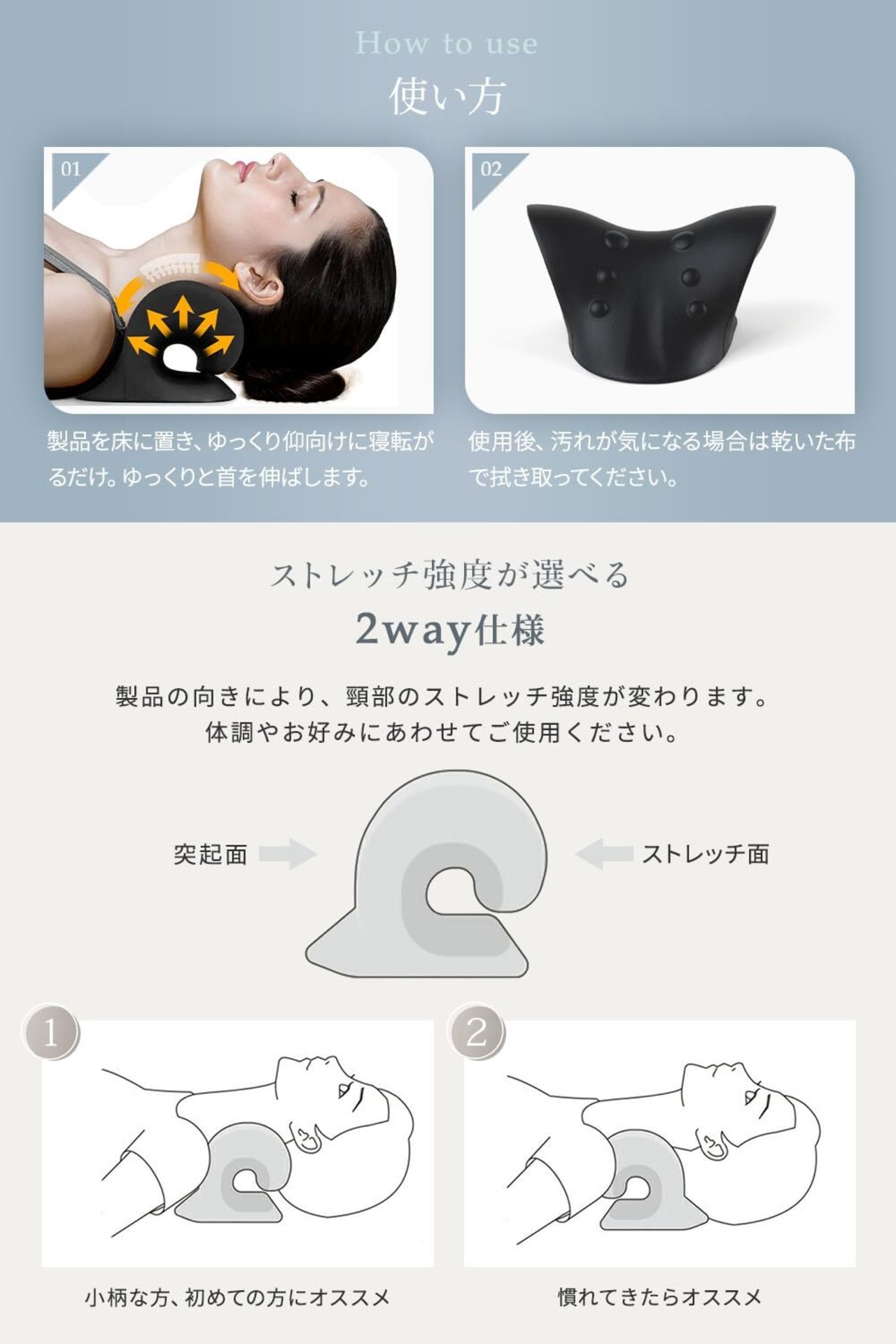 【お家時間のお供に】長時間のデスクワーク・テレワークお疲れではございませんか?さっと床において寝るだけ!1日5分程度から使用し、最長30分の範囲でご使用いただけます。お仕事の合間やお風呂上がり、テレビを見ながらなど、スキマ時間に首枕 (くびまくら)としてご使用いただき、首や肩のストレッチにご使用いただけます。