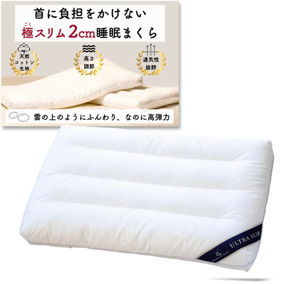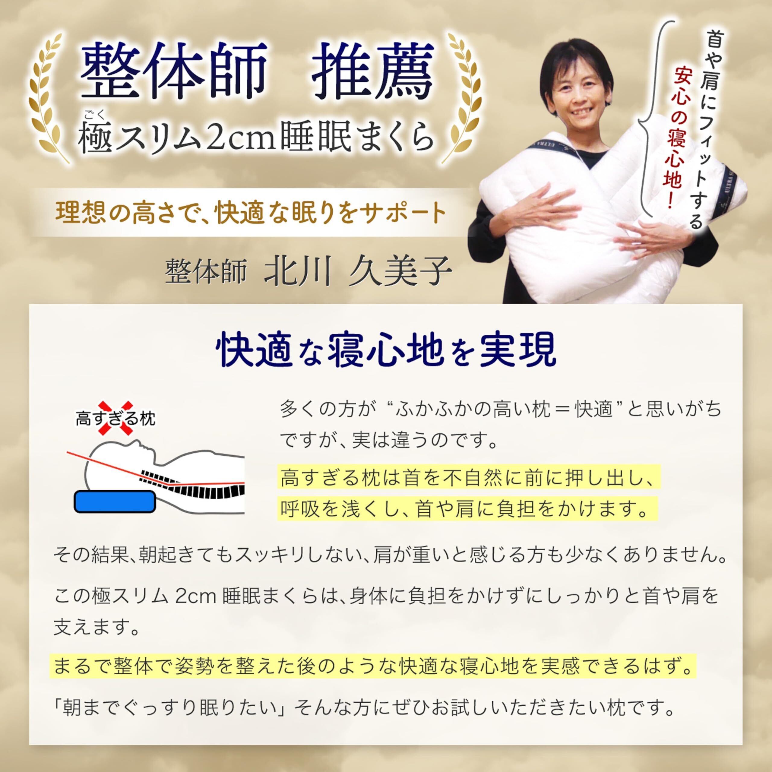 極スリム2cm 睡眠まくら ”低さ”と”寝心地”を追求 首や肩の負担を減らす 枕 低め 低い枕 薄い枕 薄い 洗える 第三者機関で洗濯テスト済み 整体師が推薦 柔らかい枕 通気性 高さ調整 天然コットン (40×60cm/極スリム2cm)
