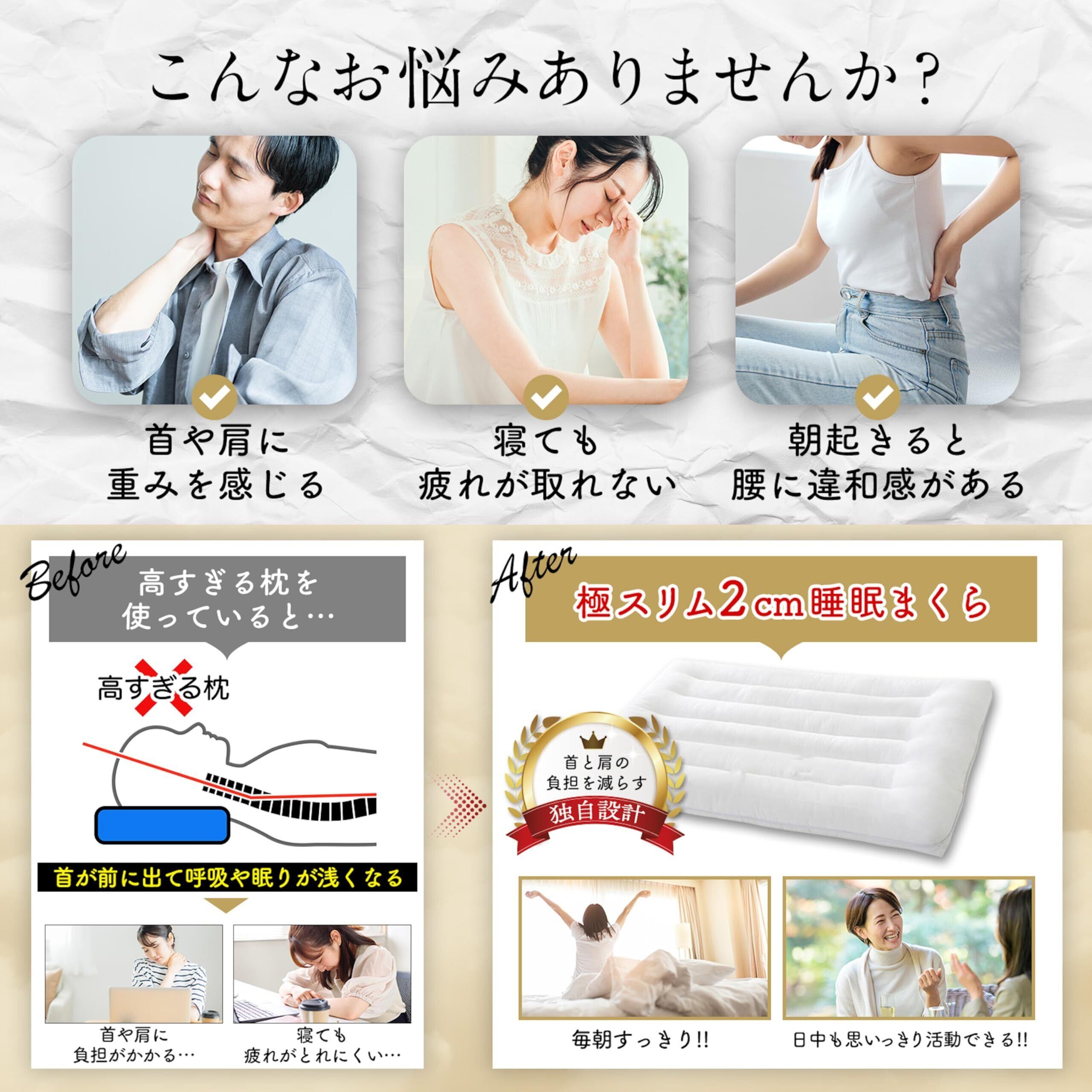 ”低さ”と”寝心地”を追求した「極スリム2cm睡眠まくら」/ 【整体師が推薦】首や肩の負担を減らしたい方のための低い枕。