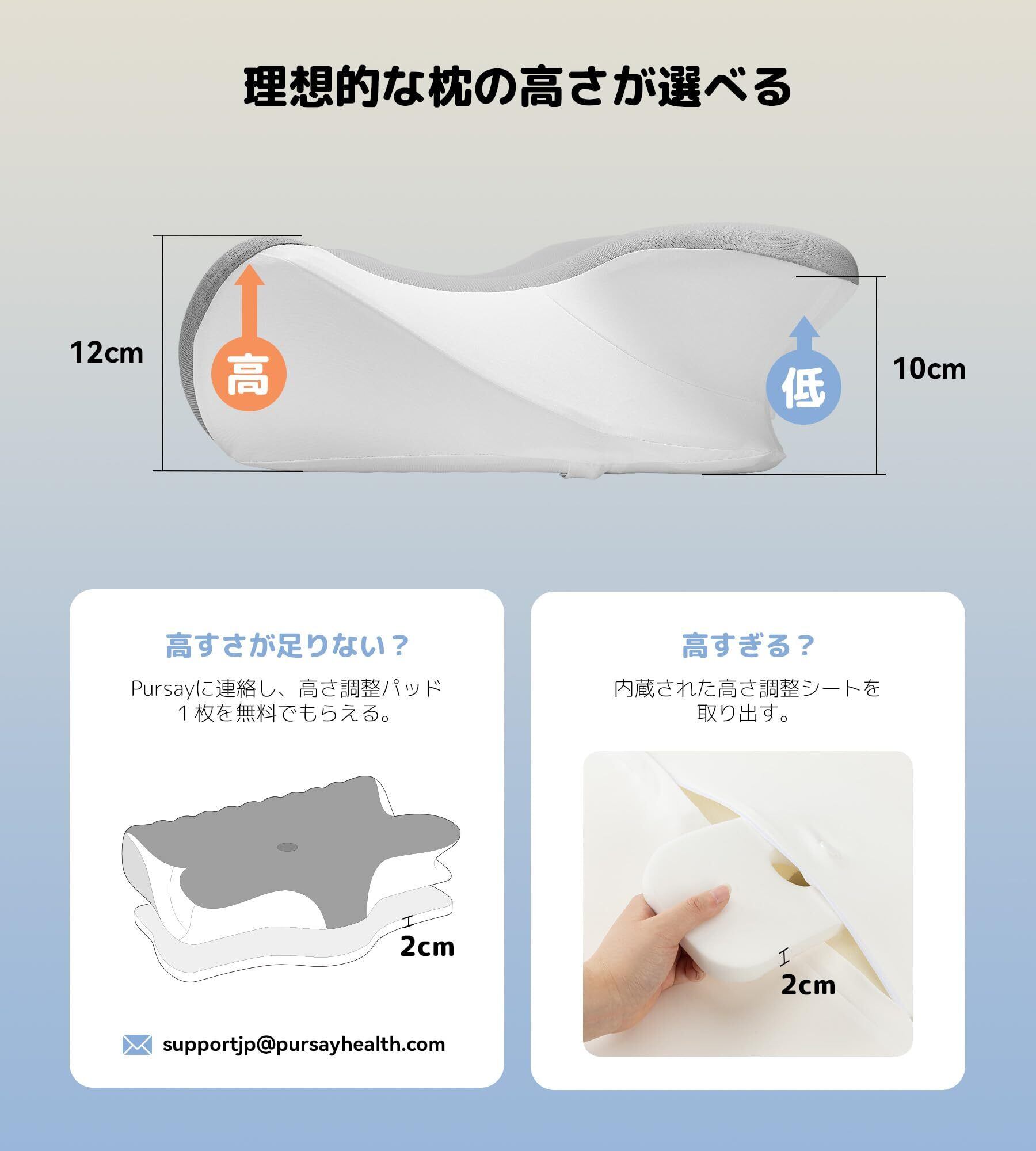 【お好みの高さが選べる】人によって快適な高さは違います。Pursay快眠枕の前後を変えることにより、10cmと12cmが選べます。厚さ2cmほどの高さ調整シートが1枚内蔵され、取り出せば、さらに低くすることができる。高い側でも十分な高さと感じない場合は、Pursayサポートまでご連絡、高さ調整パット1枚を無料でもらえ、まくら全体の高さを2cmほど高くすることができます。お客様は自分の体格によって、低めの枕と高めの枕を自由に調整でき、理想の高さで心地よく眠れる。