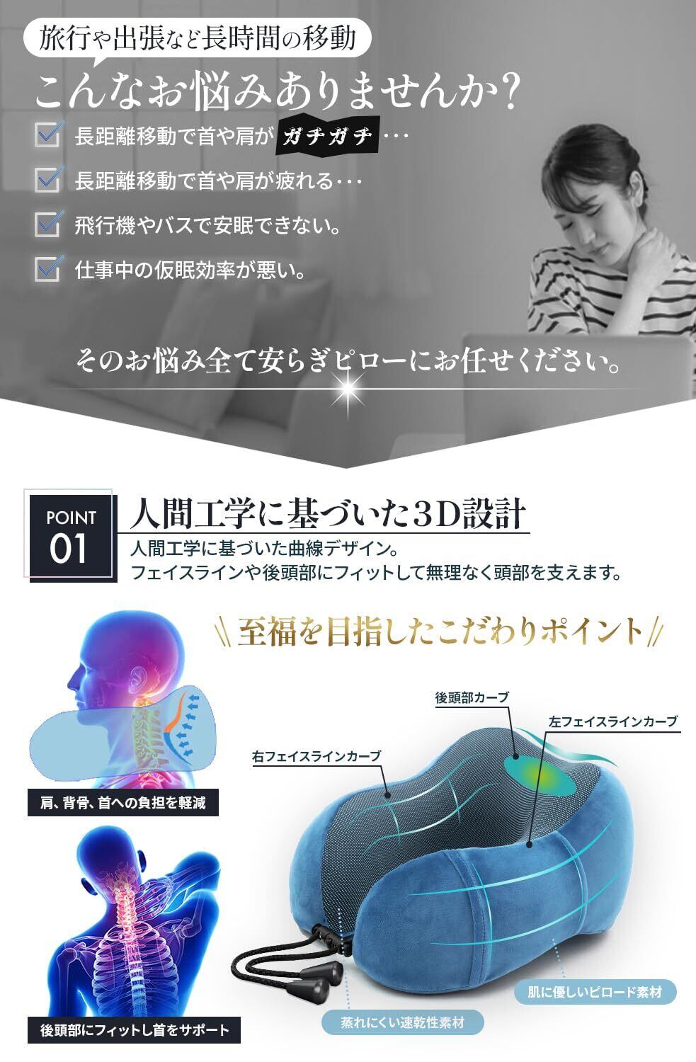 特徴 ●ランキング三冠獲得, ●人間工学に基づいた3D曲線デザイン, ●旅行や出張などの新幹線や電車、飛行機の機内、夜行バス。
