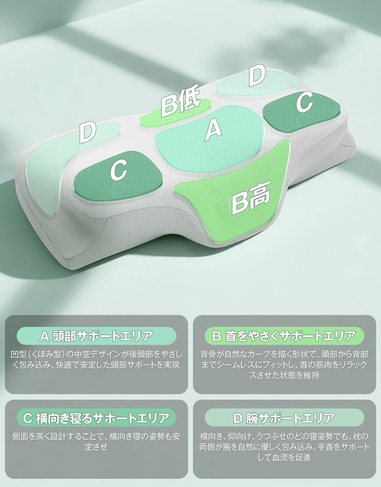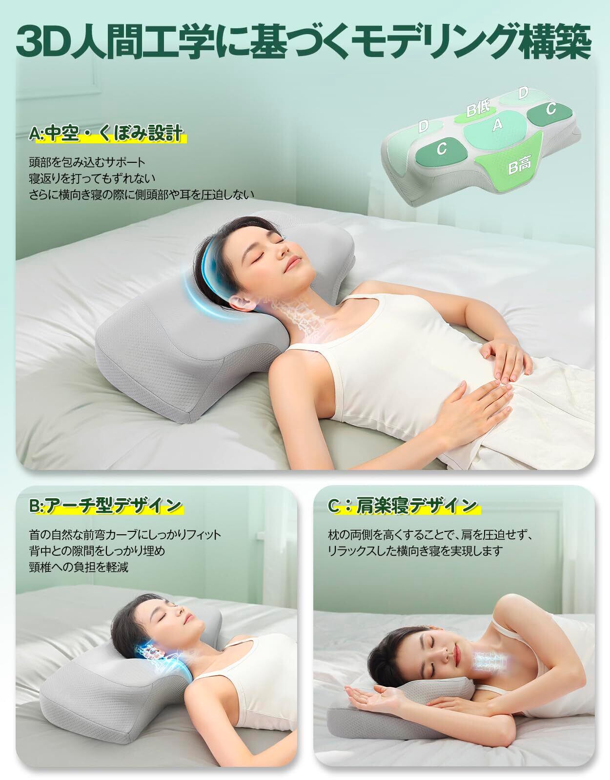 【頭・首・肩にフィットする3D立体人間工学設計】寝姿勢でも自然なネックラインをキープし、優しいサポートで首の負担を軽減。頭: 凹型の中空設計、頭部をしっかりとサポート 首:アーチ型のデザイン 肩: 側睡用の高さを上げる設計、横向き寝にピッタリする快眠枕です。朝の目覚めがスッキリと爽やかになる、Tillmulya安眠枕は極上のフィット感を提供します。疲れ知らずの快適な睡眠をサポート!この低反発枕も横向き寝、仰向け寝、うつ伏せ寝を問わず、どの姿勢でも快適に眠ることができます。