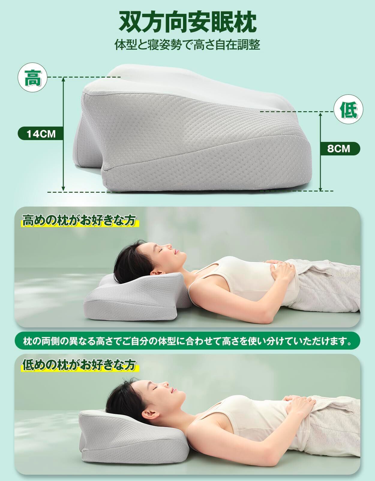 【高さ調整可で低め/高め自由選択】当社の安眠枕 pillowはは2段階の高さ(低い側は8cm、高い側は15cm)設定が可能。まくらの高さを自分好みにカスタマイズ!ご自身の体型に合わせて低めの枕と高めの枕を自由に切り替えることができます。高枕派・低枕派どちらも納得の快眠サポートを実現。 ヒント:この枕の一番高い部分(15CM)でも高さがまだ足りないと感じる場合は、下にタオルを敷いて高さを調整することができます。