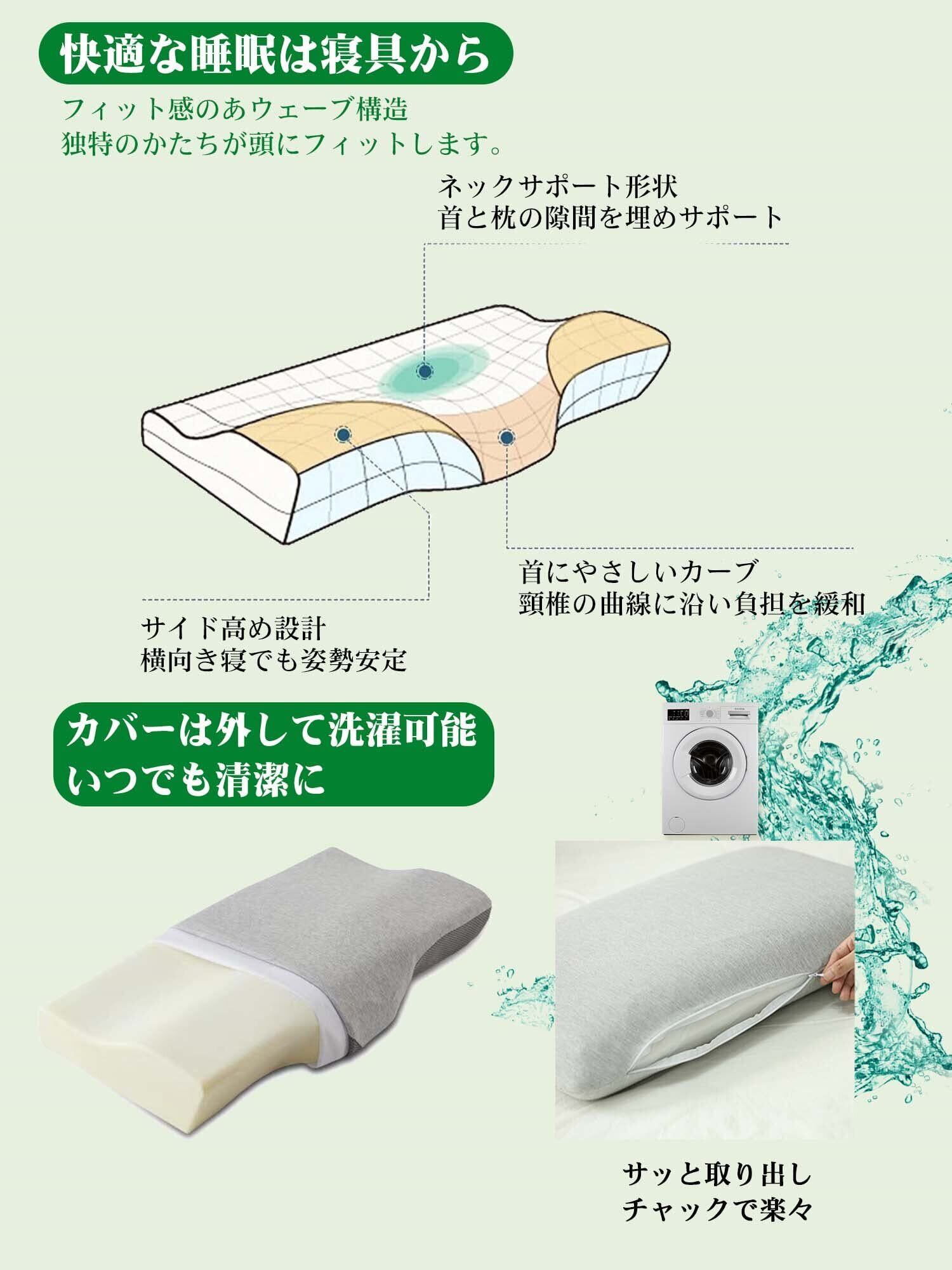 【材質】優れた高品質メモリーフォムを採用し、入眠時に肩、首、頭部に受ける圧力をバランス分散し、最適な寝心地のよさを提供し、リラックス効果が得られます