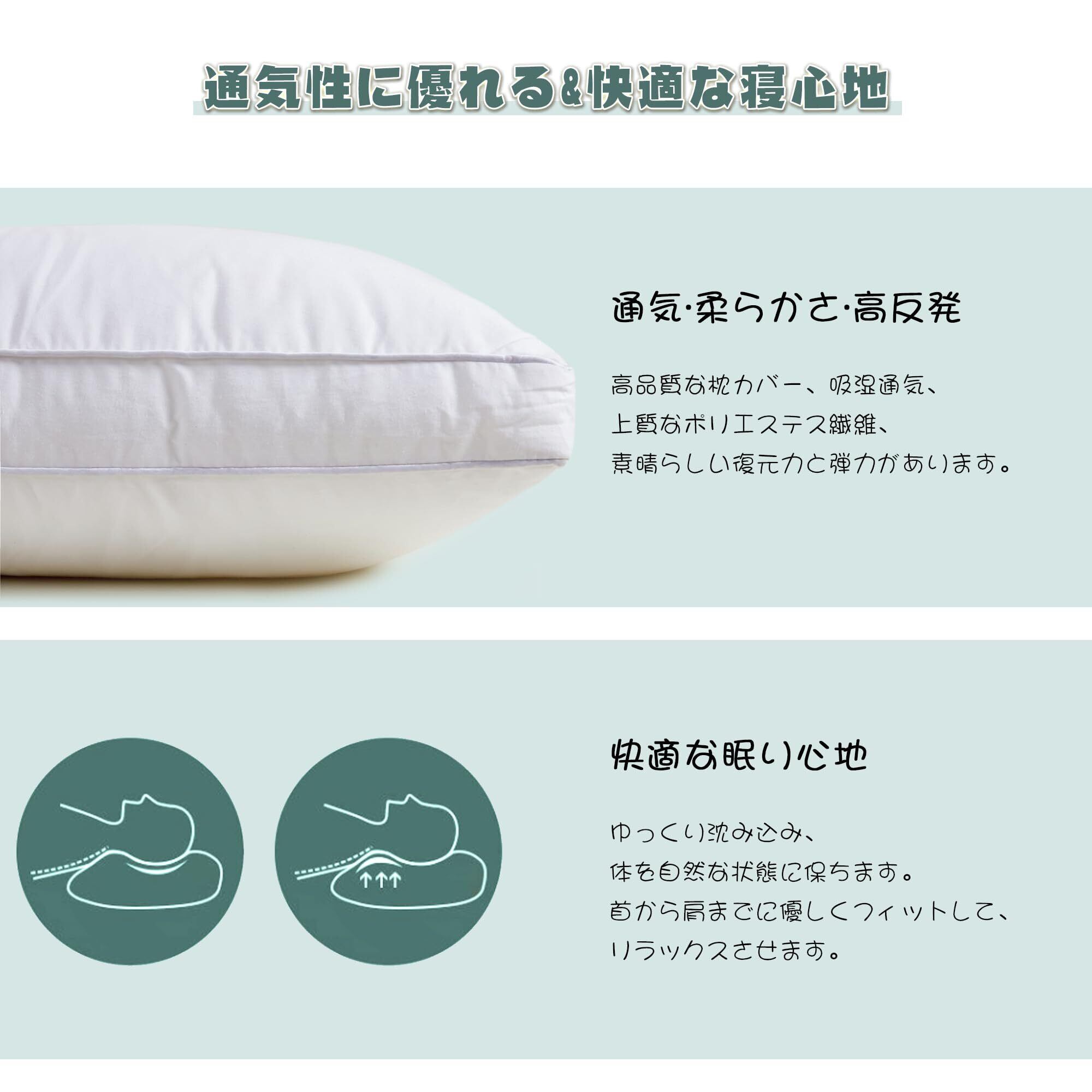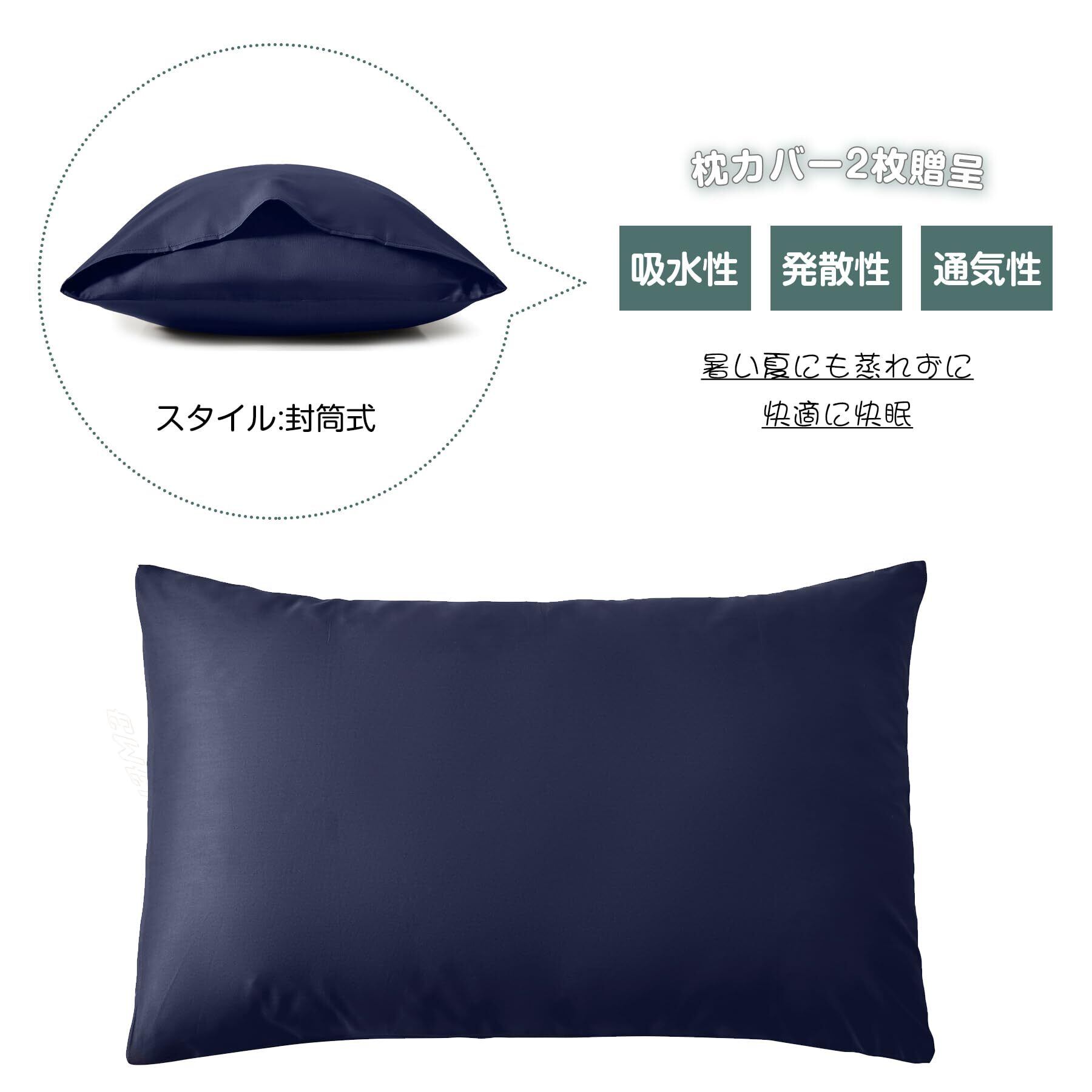 【枕カバー2枚付き】付属の枕カバーは100%ポリエステル製で、肌触りが非常に柔らかく、敏感肌の方でも安心してお使いいただけます。洗濯も簡単で、清潔さを保ちながら長くご使用いただけます。