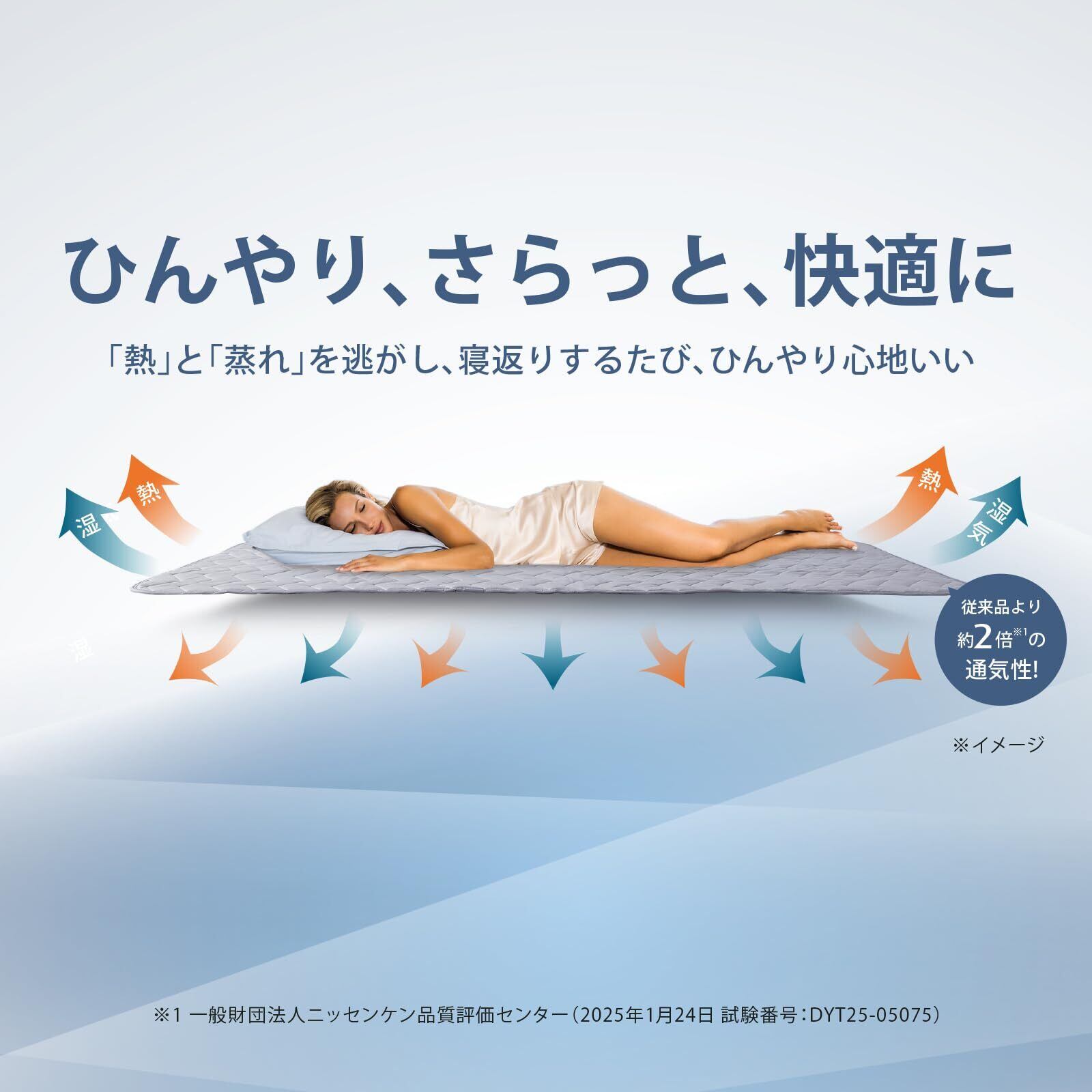 詰物がメッシュとマイクロファイバー綿を使用した二層構造になっており、身体から出る熱や蒸れをスムーズに解消し、従来品と比較し約1.6倍の通気を確保