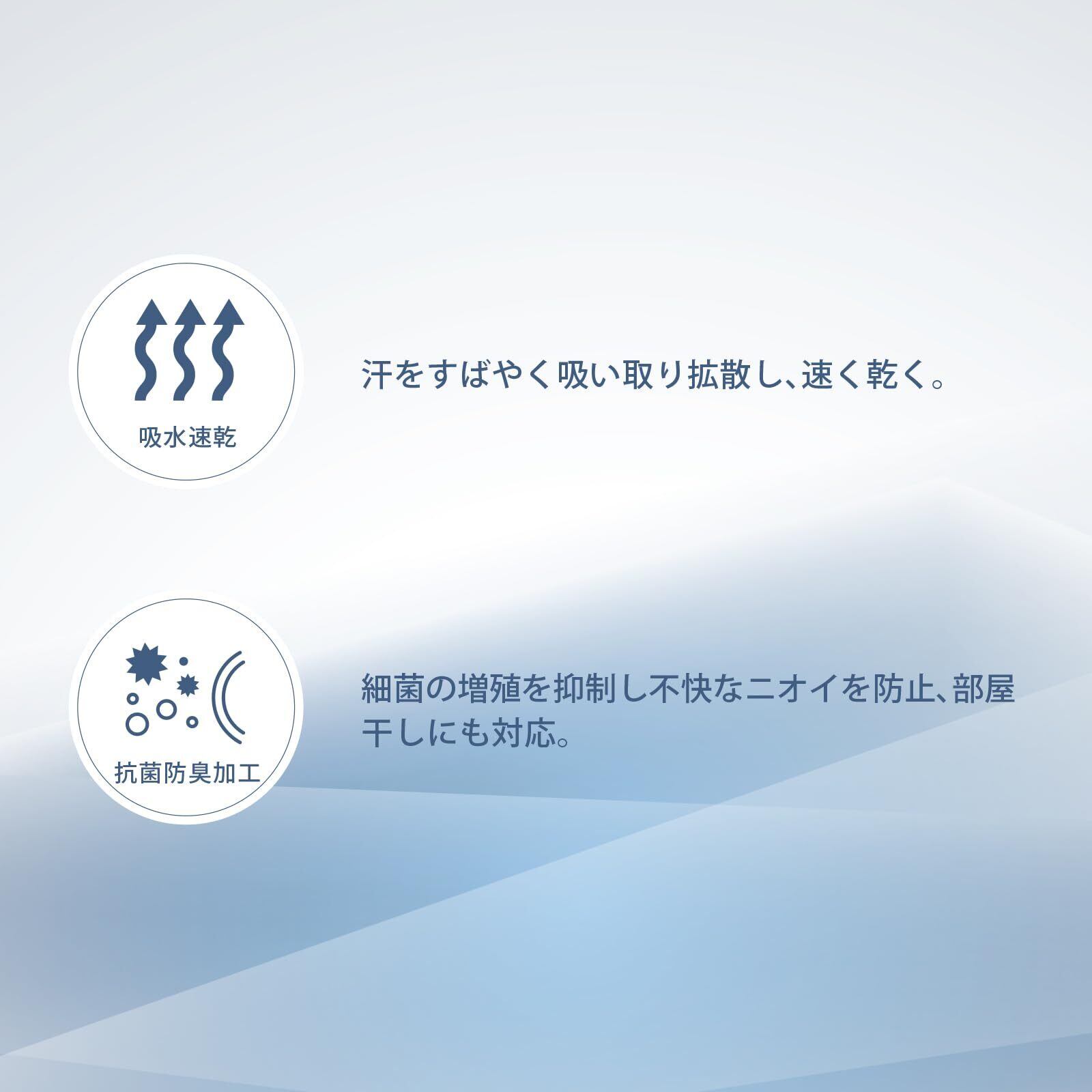 吸水速乾:汗をすばやく吸い取り拡散し、速く乾く。 抗菌防臭加工:細菌の増殖を抑制し不快なニオイを防止、部屋干しにも対応。 優しい肌ざわり:極細繊維で作ったマイクロファイバー綿を使用、柔らかで優しい使い心地。