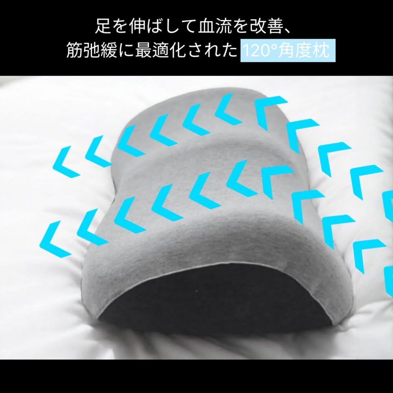 ②人間工学に基づいた片側高低設計 両端の高さが異なるスロープ形状で、脚の自然な角度をサポート。就寝中の足首やふくらはぎの負担を軽減し、理想的な寝姿勢へ導きます。