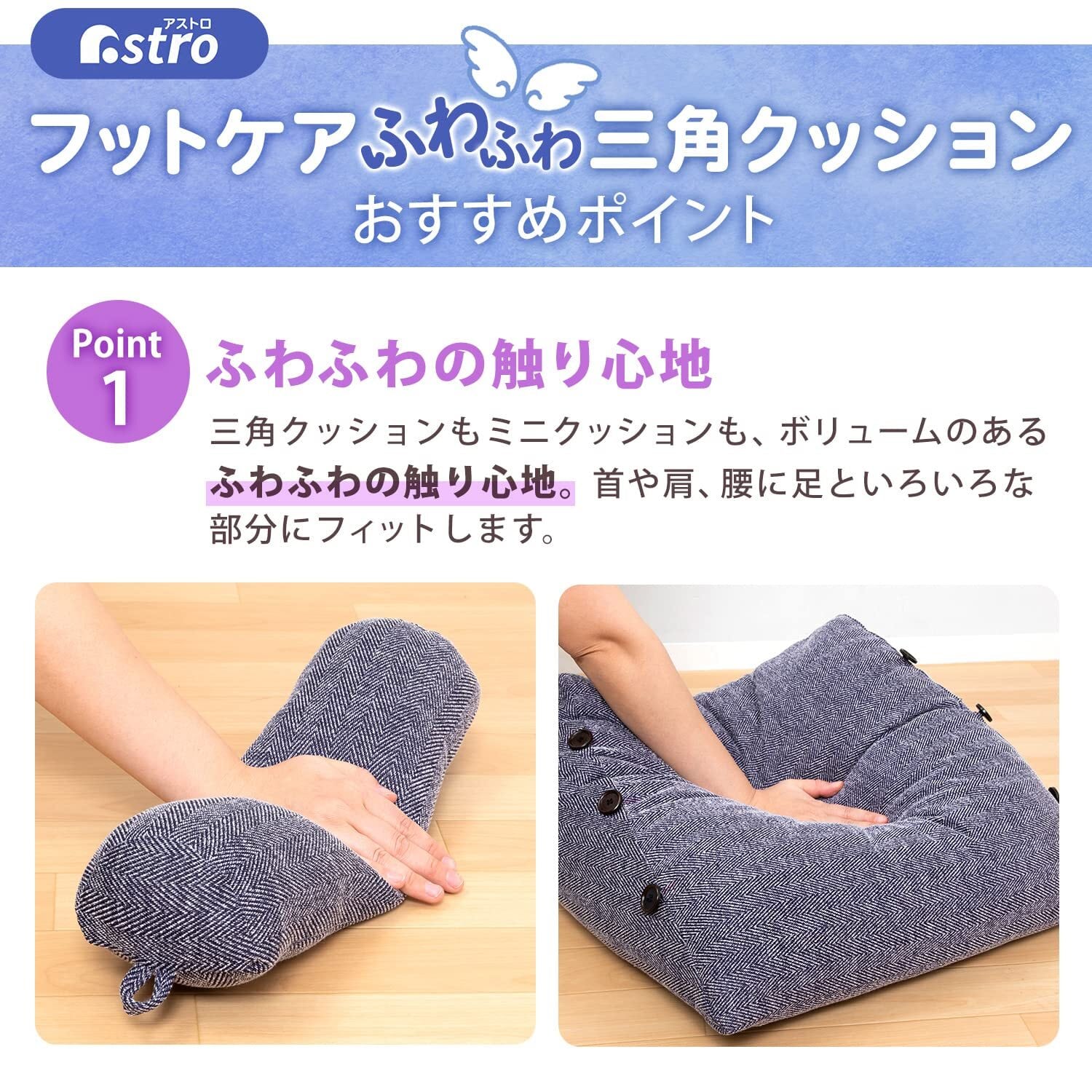 【足の疲れケアにちょうどいい角度】足の血流やむくみをケアするときは心臓よりも高い位置に足を上げることが効果的と言われていますが、足を高く上げすぎても効率よくケアすることができません。「アストロ フットケアふわふわ三角クッション」は、足の疲れやむくみのケアをしたいときに適度な角度約28°に設定。足をのせても高すぎず低すぎないので、リラックスタイムにゆったり気楽に足の疲れケアができます。