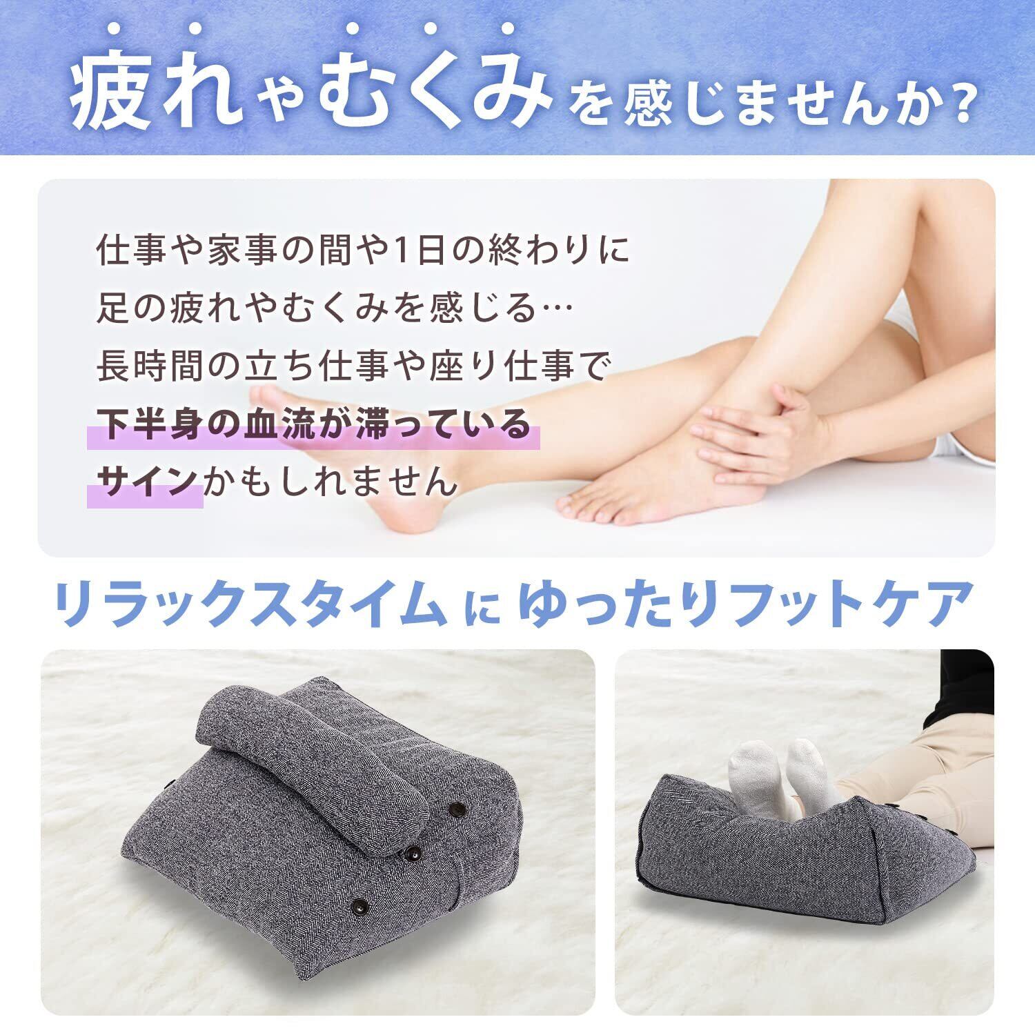 【足をのせるだけの足の疲れやむくみケア】クッションに足をのせることで足の位置を心臓より高くして血流改善を促し、下半身に溜まった老廃物や疲労物質を流れやすくして足の疲れや代謝ケアをすることを目的としたフットケア用リラックスクッションです。
