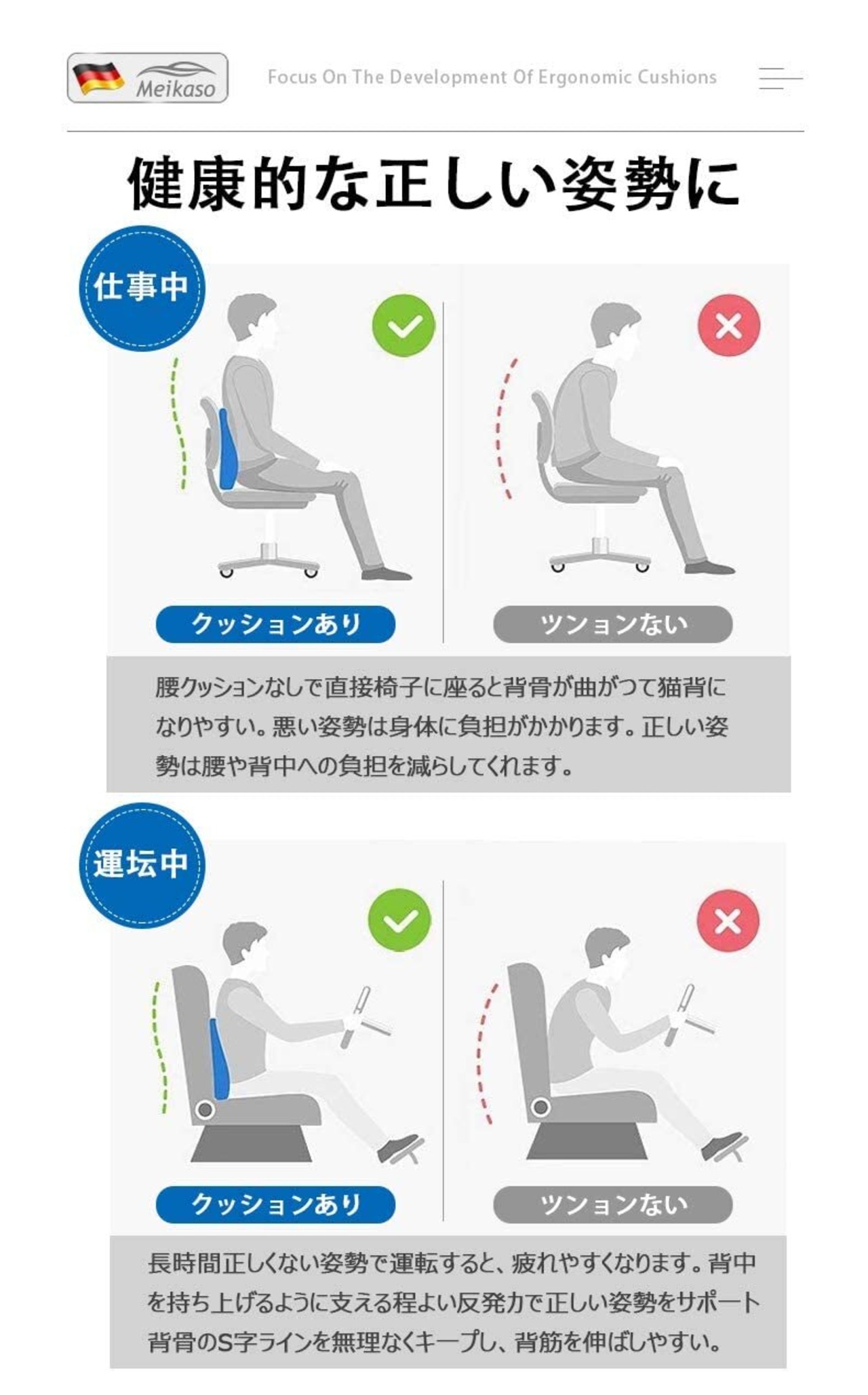 【従来品と違い、新型設計でもっ】人間工学に基づき、商品全体設計は75°斜めになり、クッションと椅子の隙間をしっかり埋め、長時間のデスクワークやドライブなどに腰から背中をやさしく体を包み込むランバーサポートです。