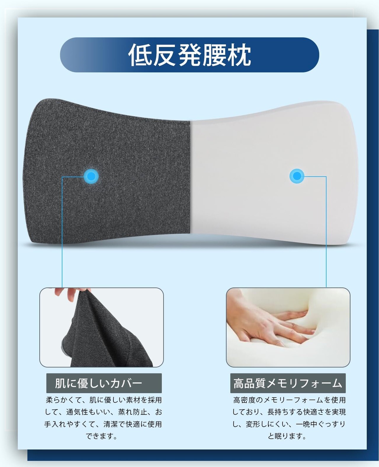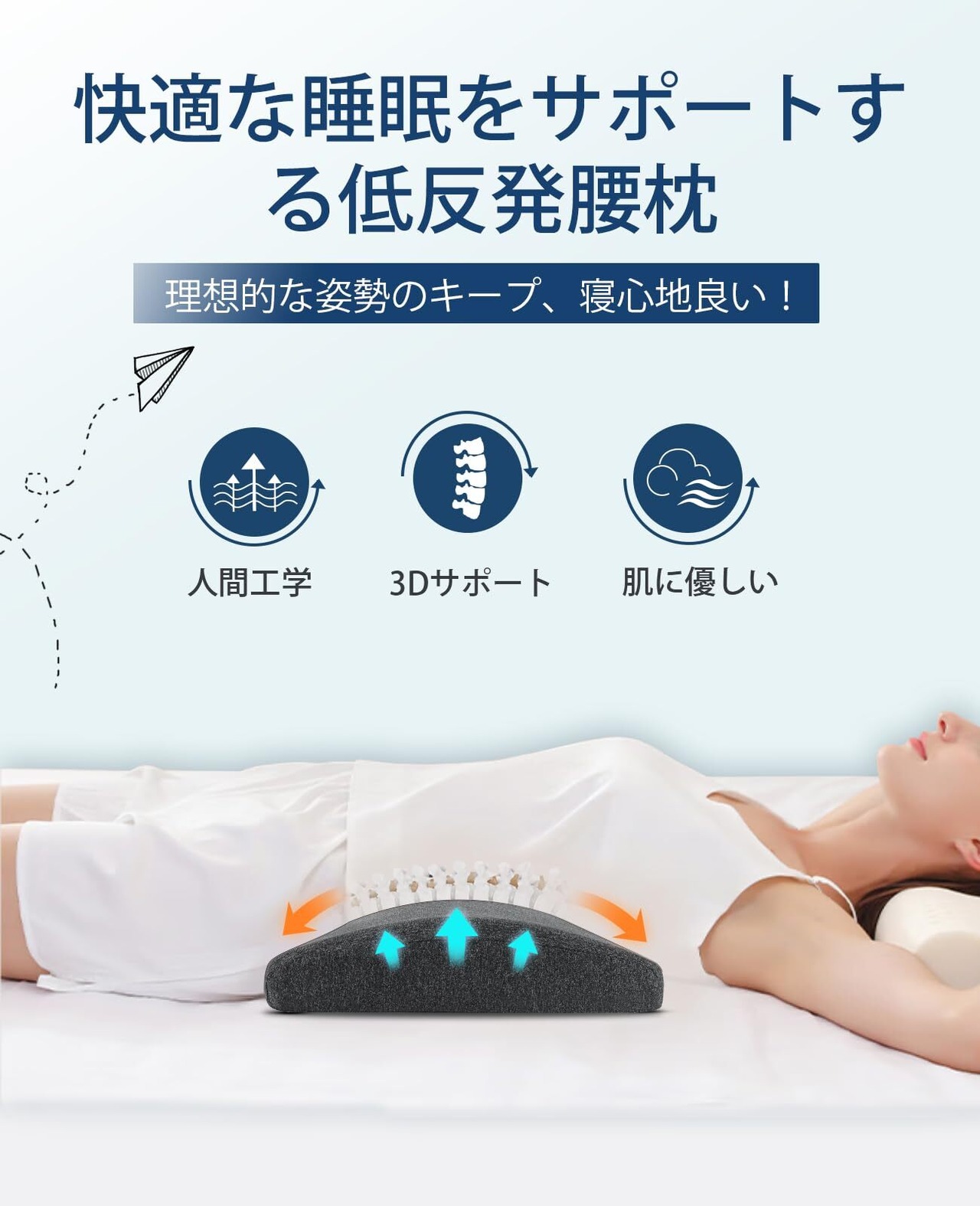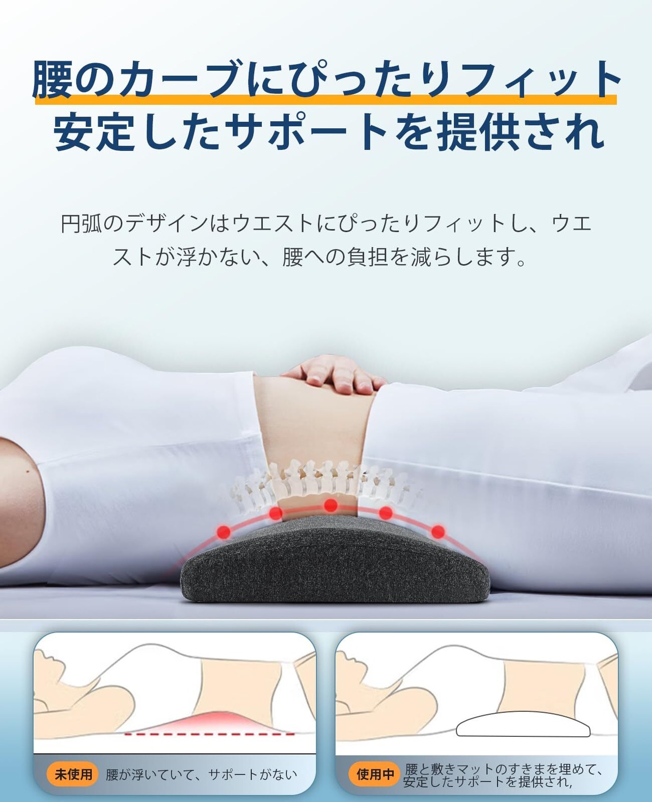【人間工学、寝心地良い】優れた低反発メモリーフォームを素材にして、崩れにくい、人間工学を基づき、腰のカープにフィートします。柔らかくて、寝ていると違和感がなく、60cm長さ、5.5cm適度な高さで、仰向きでも、横向きでも、寝返りも腰と敷きマットのすきまを埋めて、安定したサポートを提供します。快適に眠れます!