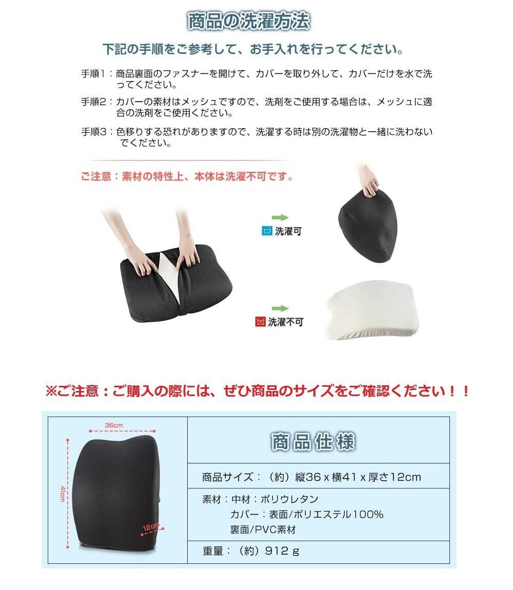 サイズ:(約)縦36x横41x厚さ12cm (ご注意:ご購入の際には、ぜひ商品のサイズをご確認ください!!) 素材:中材:ポリウレタン(高品質ウレタン) カバー:表面/ポリエステル100%(通気メッシュ素材)、カバーを取り外して洗えるので、お手入れも簡単。裏面:滑り止めと粘着防止のある粒子状の素材を使用。