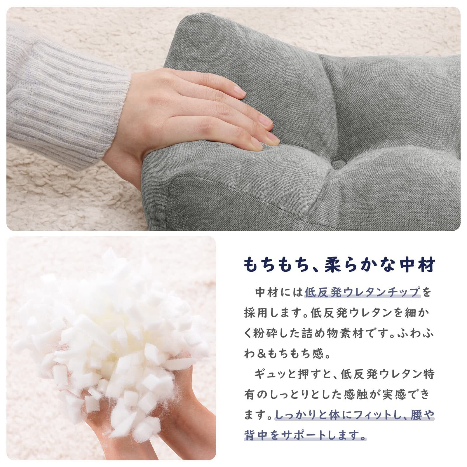 低反発ウレタンチップを採用:中材には低反発ウレタンチップを採用します。低反発ウレタンを細かく粉砕した詰め物素材です。ふわふわ&もちもち感、通気性もばっちり。ギュッと押すと、低反発ウレタン特有のしっとりとした感触が実感できます。しっかりと体にフィットし、腰や背中をサポートします。優しく腰を支えることにより、腰の筋肉をリラックスさせ、さらに産後、腰楽に可能です。