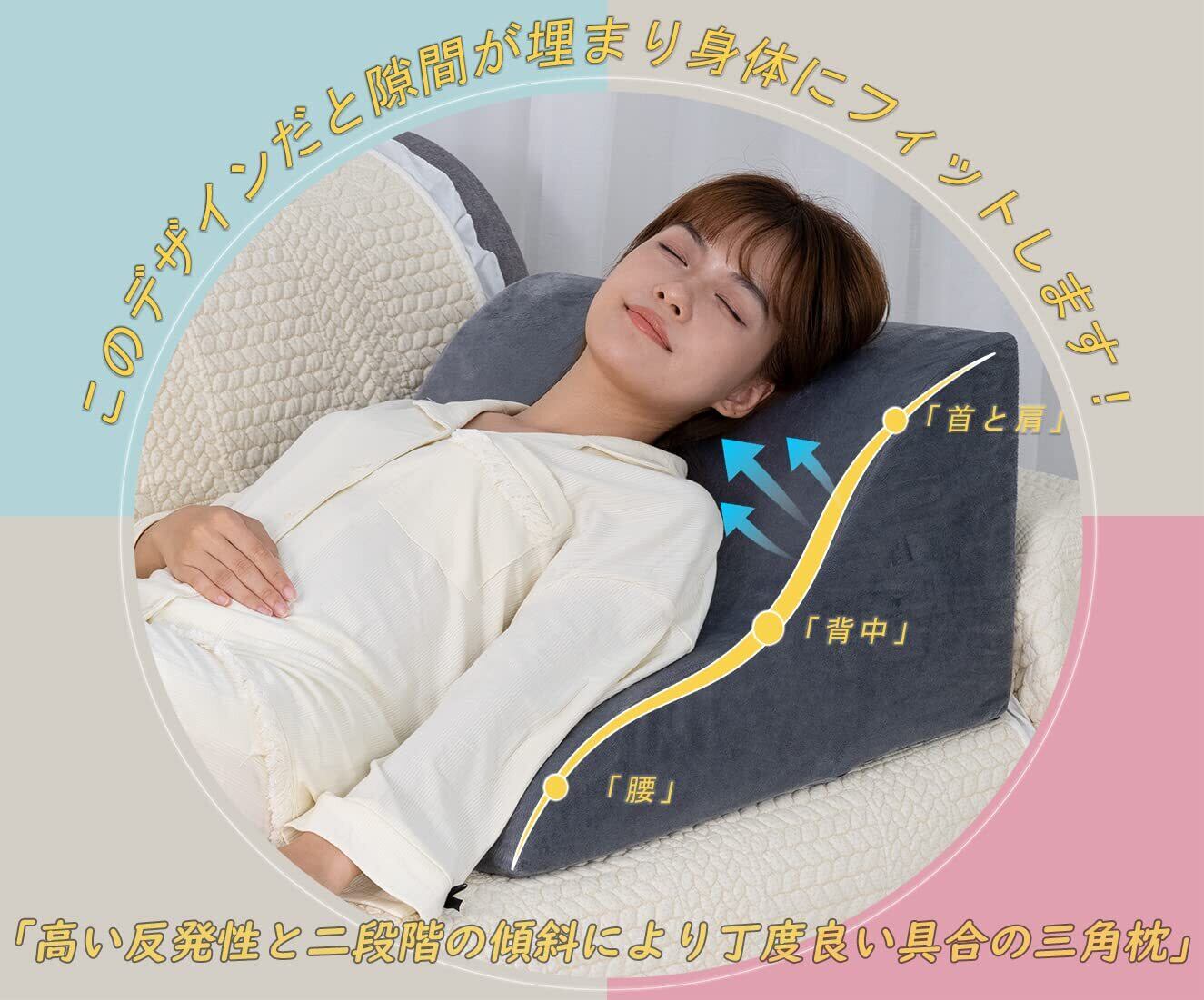 【三角クッションのこだわり】高弾性、高反発のあるウレタンフォームを使用し、適度な硬さは身体を支えることができ、体圧を分散することができます。人間工学に基づいたデザインで、隙間が埋まって身体にフィットします。頭、肩、首、背中、腰への負担を軽減し、正しい座り方や寝姿勢を維持することが期待できます。