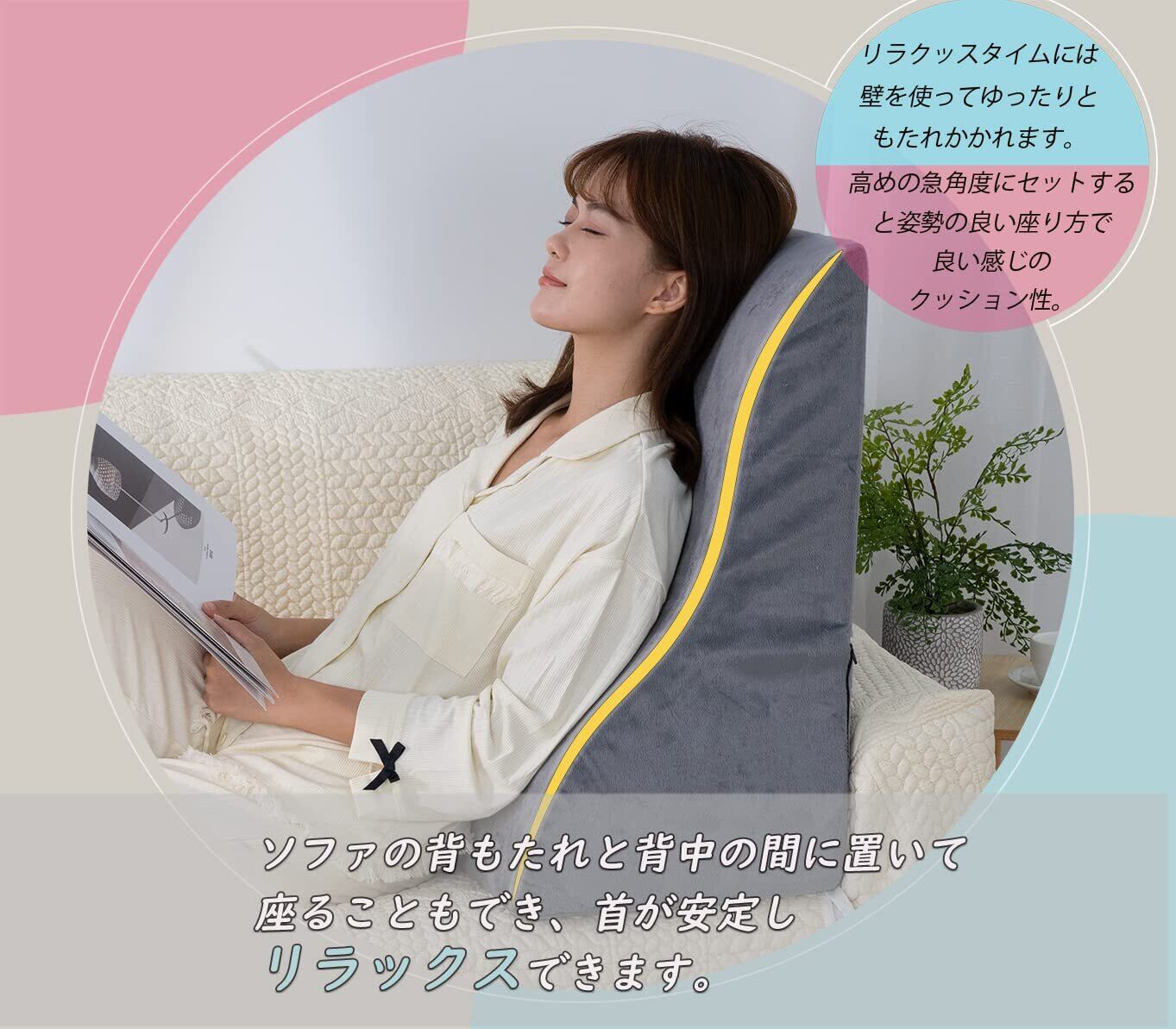 【縦置き】壁との間に置いても、もちろんソファーの背もたれと背中の間に置いて座ることもでき、首が安定してリラックスできます。三角クッションで折れないタイプなので、背もたれに立てかけると安定感抜群で、フィット感も良く、簡易的な背もたれながらも、ソファーにもたれているより楽ちんです。また、この三角クッションなら読書やタブレットを長時間楽しむことができ、疲れにくいです。