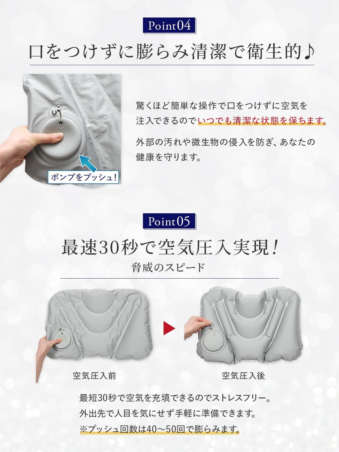 【口をつけない清潔仕様】移動中にクッションにエアーを入れるのは周囲の目が気になるし、ちょっと面倒くさい…と思ったそこのあなた!ご安心ください。「MUMULOT」の腰枕はエアーポンプが本体に内蔵されているので口をつけずに手動で約30秒~60秒プッシュするだけで簡単に膨らむ清潔で衛生的な便利グッズですまた空気量を調整してお好みの厚みに膨らませることができるので、あなたの腰痛を和らげるベストな座り心地を探って下さい。