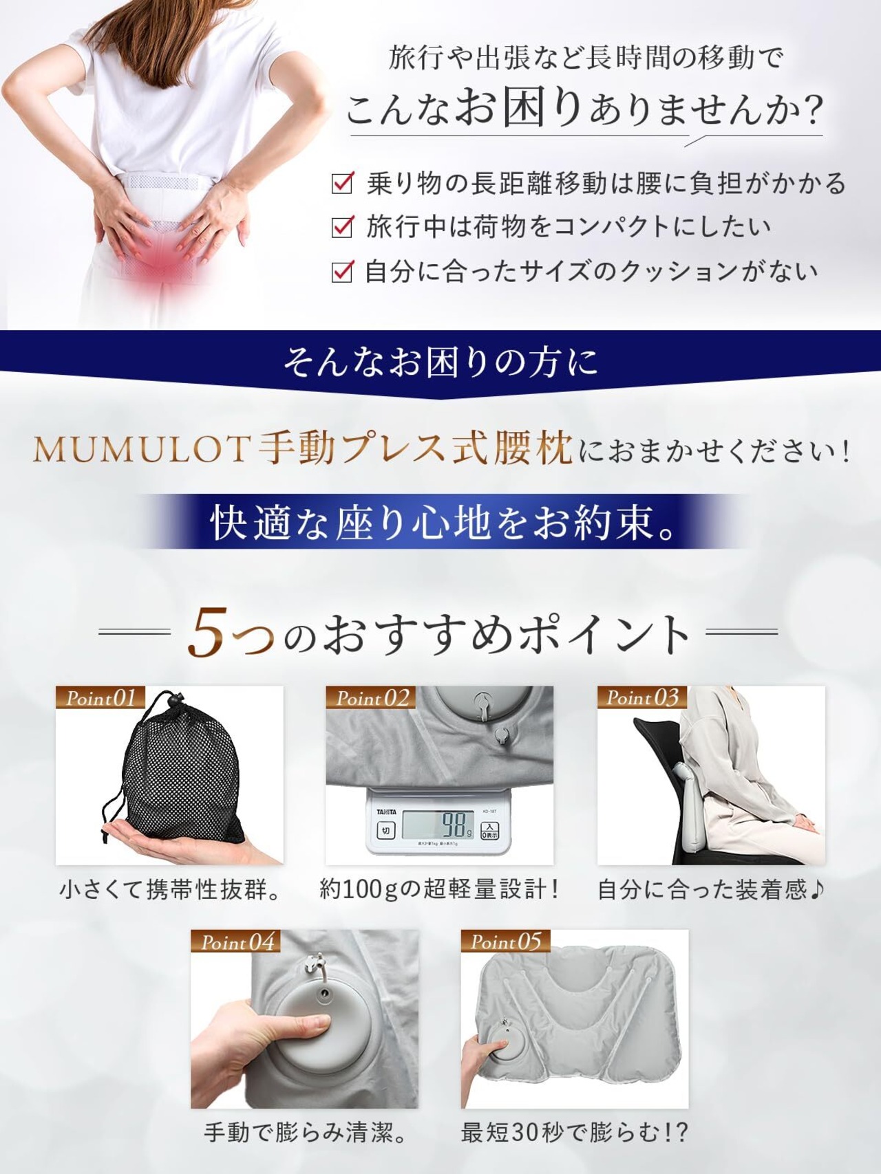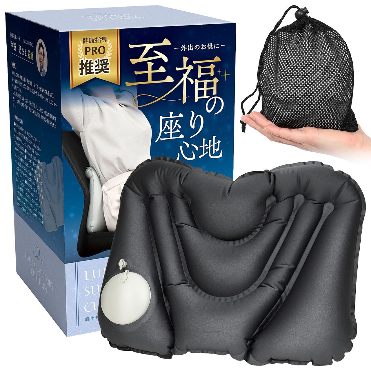 健康指導の中野先生が監修】腰痛 クッション 腰まくら 携帯 飛行機 快適グッズ 旅行 便利グッズ 海外旅行 エアー 持ち運び 夜行バス 腰枕 MUMULOT (濃い灰色)