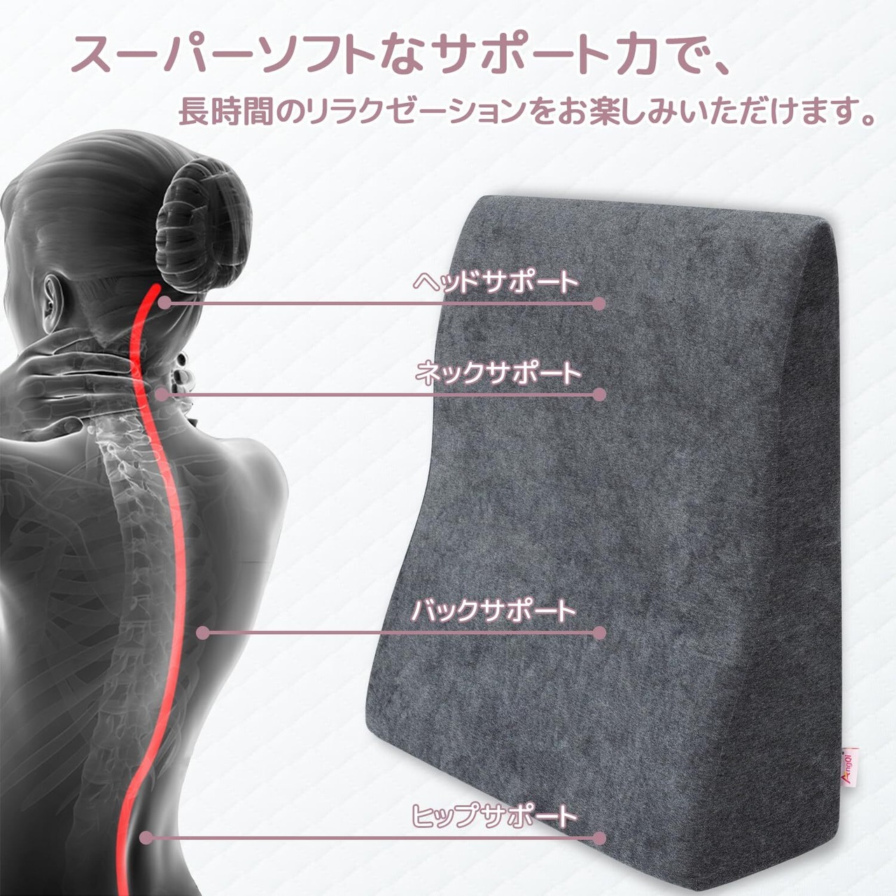 【三角クッションのこだわり】高弾性、高反発のあるウレタンフォームを使用し、適度な硬さは身体を支えることができ、体圧を分散することができます。人間工学に基づいたデザインで、隙間が埋まって身体にフィットします。頭、肩、首、背中、腰への負担を軽減し、正しい座り方や寝姿勢を維持することが期待できます。