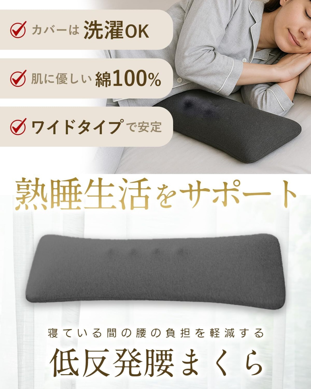 【産後のママも通う女性専用整体師さん推奨】 もう腰で悩まない!睡眠の質を上げる 就寝用 低反発 腰枕|朝までぐっすり 腰痛改善 グッズ 腰まくら 【つらい朝の腰…あきらめていませんか?】 「朝起きると腰がズーンと重い」「マットレスが合わず、夜中に何度も目が覚める」「反り腰で寝姿勢が定まらない」…。そんなつらい腰のお悩みを抱えるあなたのために開発されたのが、この就寝用 低反発 腰まくらです。いつものマットレスにプラスするだけで、睡眠の質が劇的に変わる、新しい眠りの習慣を始めませんか? 【なぜ、この腰枕が選ばれるのか? 3つの理由】 理想のS字カーブをキープ: 人間工学に基づいた独自の緩やかカーブが、寝ている間の腰とマットレスの「すき間」にジャストフィット。腰への負担が少ない理想的な寝姿勢を朝まで自然に保ちます。つらい反り腰のサポートや、産後の骨盤矯正の補助としてもおすすめです。 とろけるようなフィット感、こだわりの低反発素材: 圧力に応じてゆっくりと沈み込む高品質な低反発ウレタンを採用。体圧を巧みに分散し、一点に集中しがちな負担を軽減します。まるでオーダーメイドのようなフィット感で、あなたの腰を優しく包み込む、まさに極上のクッションです。 寝返りも妨げないワイド設計: 幅60cmのワイドサイズなので、横向き寝への移行もスムーズ。寝返りを打っても枕がズレにくく、朝まで快適な眠りを妨げません。この腰まくらは、あなたの眠りを深化させる最高の睡眠グッズです。 【腰痛改善への本気のアプローチ】 長時間のデスクワークや立ち仕事で疲れた腰を、睡眠中にしっかりケア。この腰枕は、腰痛の主な原因となる睡眠中の負担を軽減することに特化した腰痛改善 グッズです。整体やマッサージに通う時間がない方も、毎日の睡眠で手軽に腰のセルフケアが始められます。 【いつでも清潔、肌に優しい】 直接肌に触れるカバーには、通気性と肌触りに優れた生地を採用。カバーは取り外して洗濯機で丸洗いできるため、汗をかく季節も安心。いつでも清潔な状態を保てます。 ※腰まくら本体(ウレタンフォーム)は洗濯できません。風通しの良い日陰で保管してください。 【製品仕様】 商品名:就寝用 低反発 腰まくら サイズ:(約) 横60cm × 縦21cm × 高さ3cm 素材:本体 / 高密度低反発ウレタンフォーム, カバー / (肌触りの良い綿100%) 対象:腰痛、反り腰、坐骨神経痛などでお悩みの方、睡眠の質を向上させたい方、妊婦さん、デスクワーカー、産後の方など
