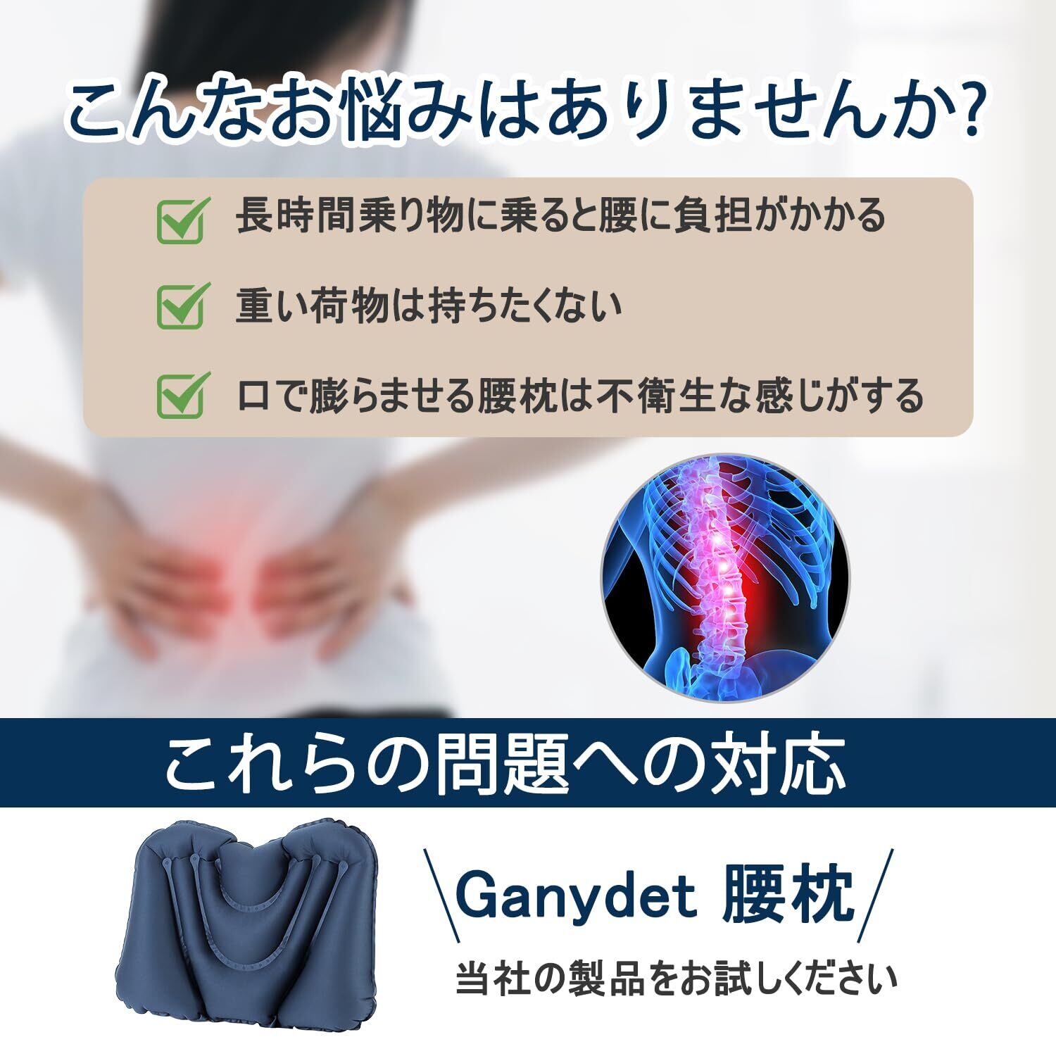 【数量限定】Ganydet 腰痛 クッション 旅行 便利グッズ 腰枕 飛行機 新幹線 夜行バス 車 持ち運び (ネイビー)