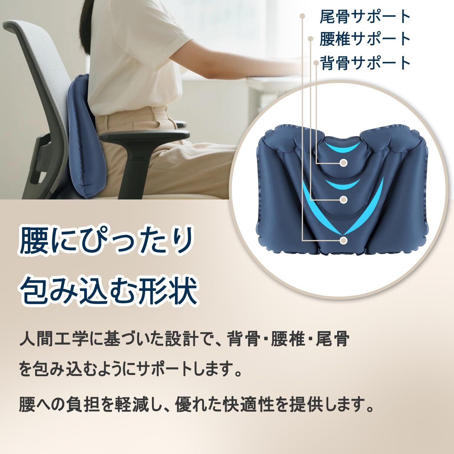 【腰にぴったり包み込む形状】人間工学に基づいた設計で、背骨・腰椎・尾骨を包み込むようにサポートします。腰への負担を軽減し、優れた快適性を提供します。