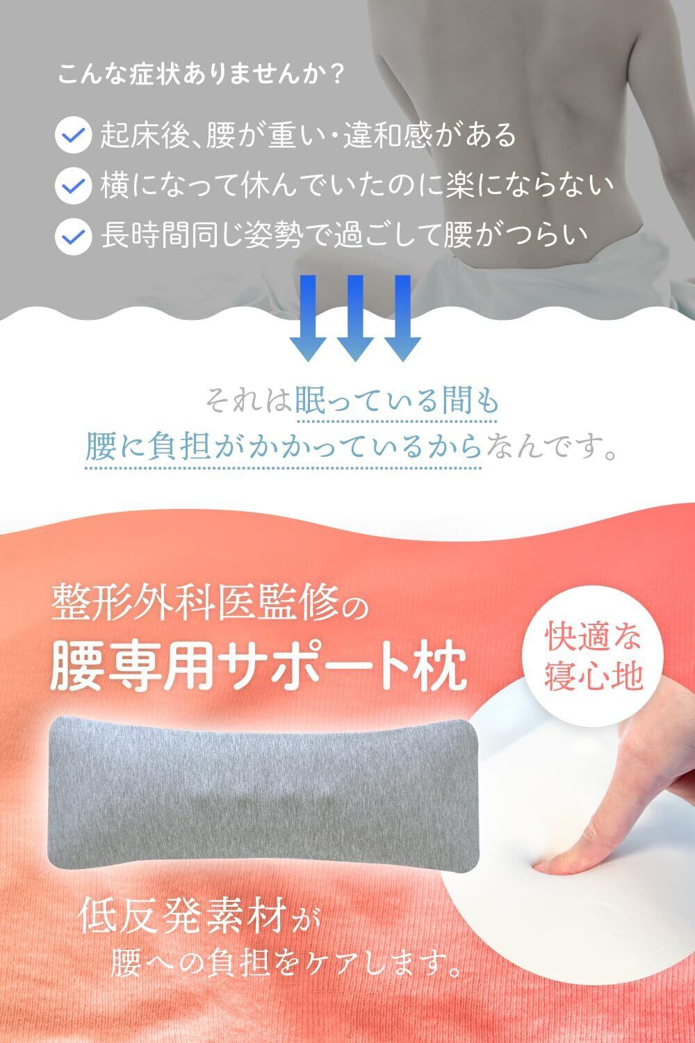 【限定セール】【整形外科医監修】腰枕 腰サポート枕 低反発 腰用 就寝用 軽量 厚さ3cm 反り腰 (グレー)