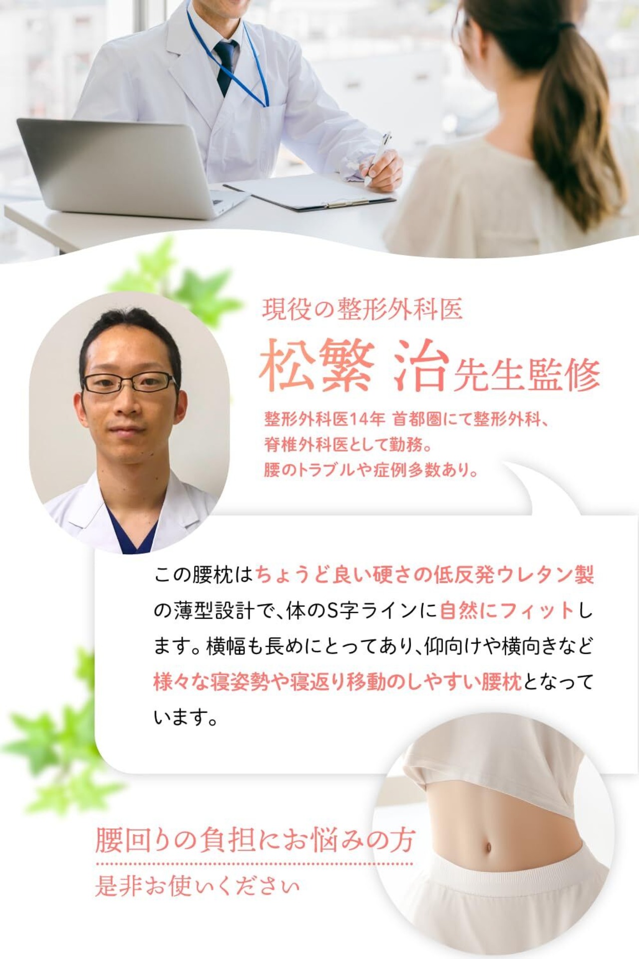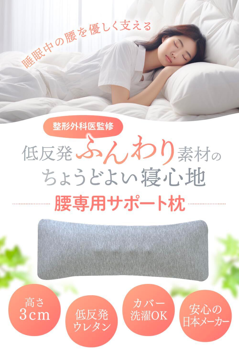 【快適な寝姿勢の維持】ソフトな素材や適切な形状設計により、腰部にやさしいサポートを提供しながら、快適な寝姿勢を維持します。これにより、体の疲れを軽減し、よりリフレッシュされた状態で目覚めることができます。快適な寝姿勢は、深い睡眠を促進し、健康的な睡眠サイクルを助けます。