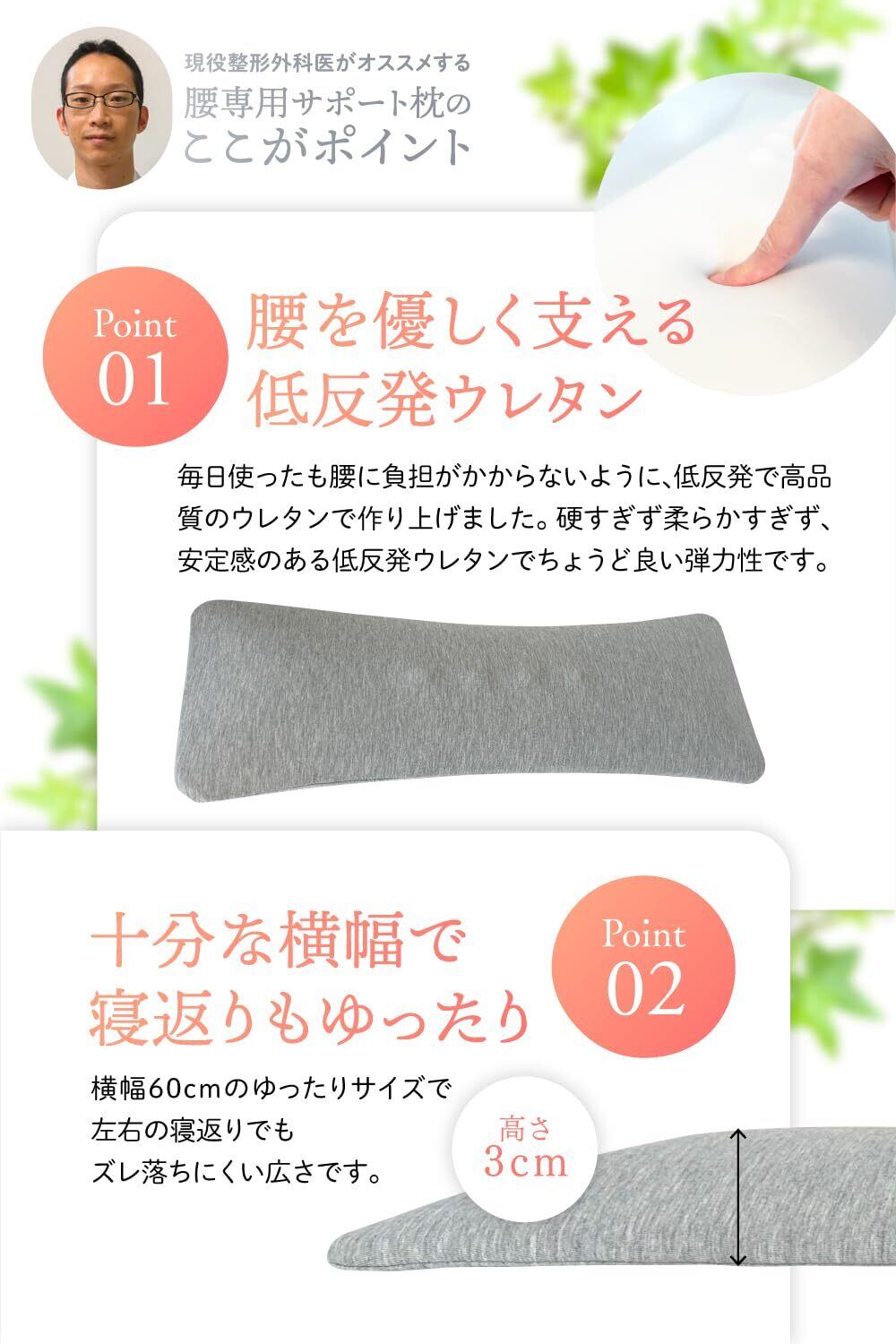 【整形外科医監修】腰枕 腰サポート枕 低反発 腰用 就寝用 軽量 厚さ3cm 反り腰 (グレー)