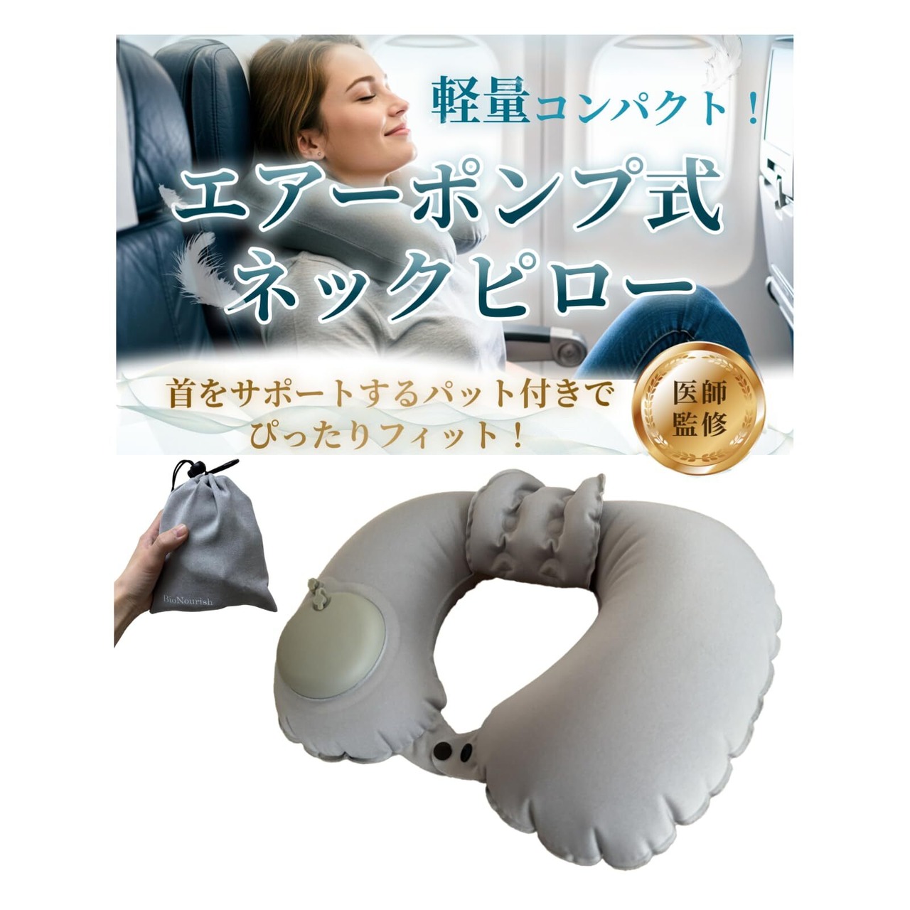 【2025最新】【医師監修】 ネックピロー 飛行機 快適グッズ 【手で押して膨らむ軽量エアーポンプ式x収納袋&ヘッドレスト付き】 エアー コンパクト 枕 旅行 便利グッズ BioNourish (グレー)