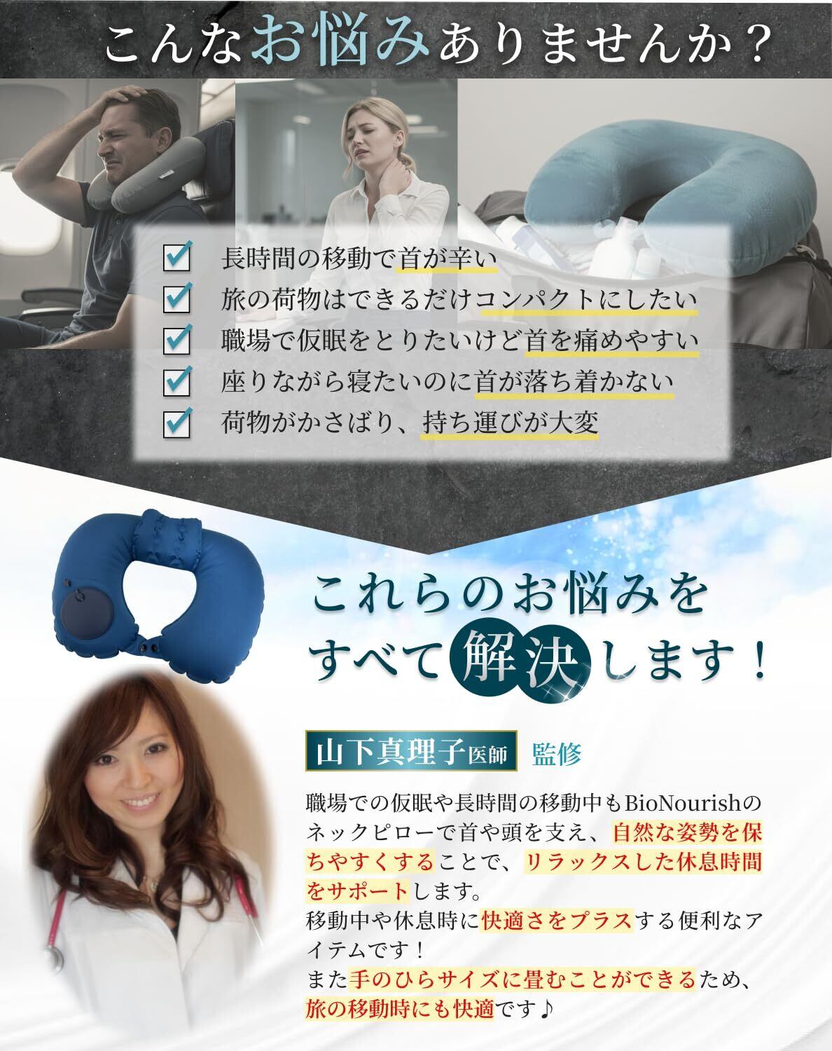【医師監修】 ネックピロー 飛行機 快適グッズ 【手で押して膨らむ軽量エアーポンプ式x収納袋&ヘッドレスト付き】 エアー コンパクト 枕 旅行 便利グッズ BioNourish (グレー)