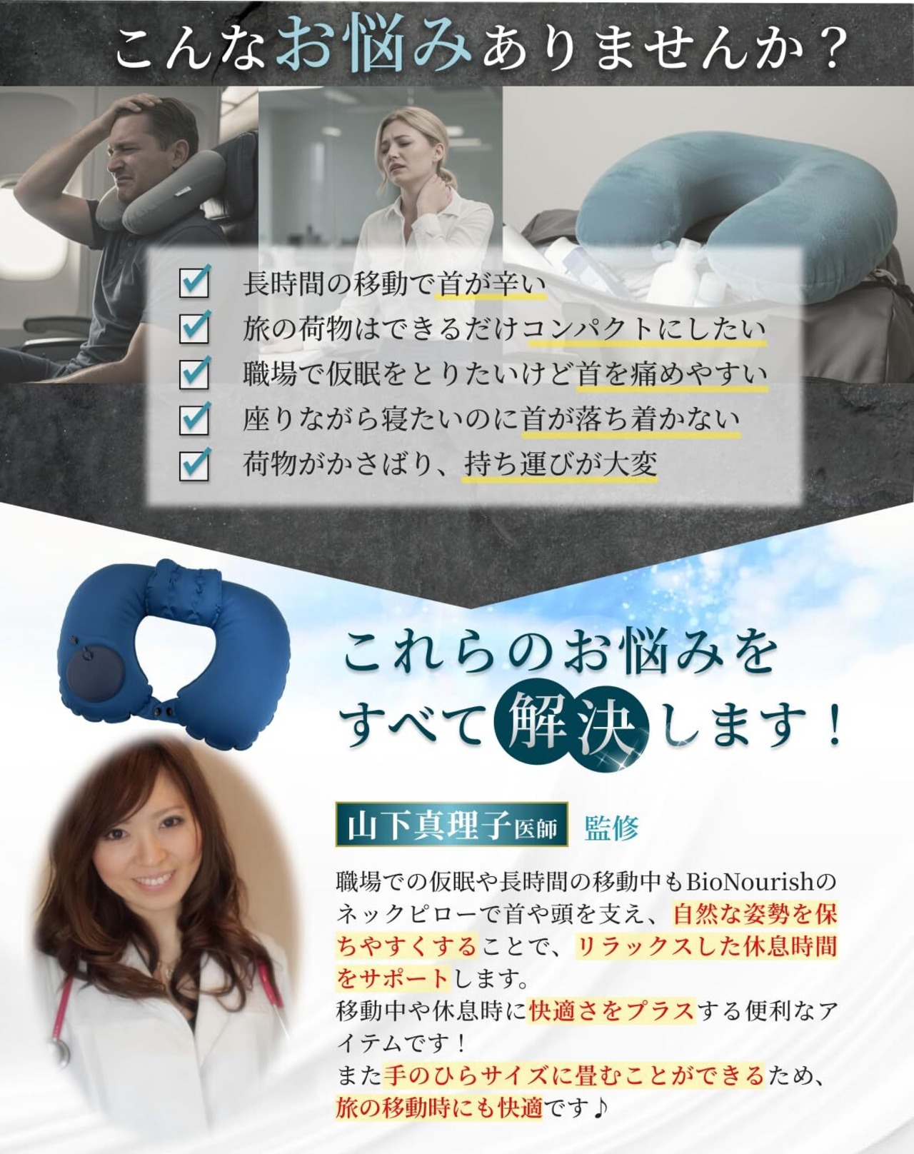 【医師監修x人間工学設計で快適フィット】 医師監修の高品質なネックピロー! ヘッドレスト付きで首や頭をしっかり支え、長時間の移動やデスクワークでも自然な姿勢をキープするエアーネックピローです。また、飛行機・新幹線・バス・職場・自宅での仮眠に最適で、大切な休息時間をもっと快適にサポートします。
