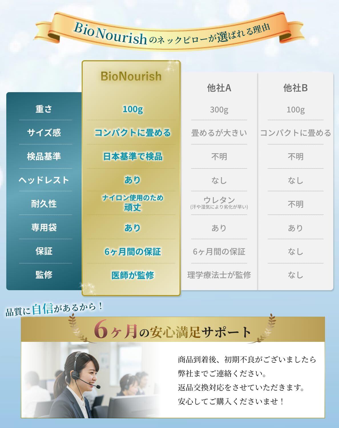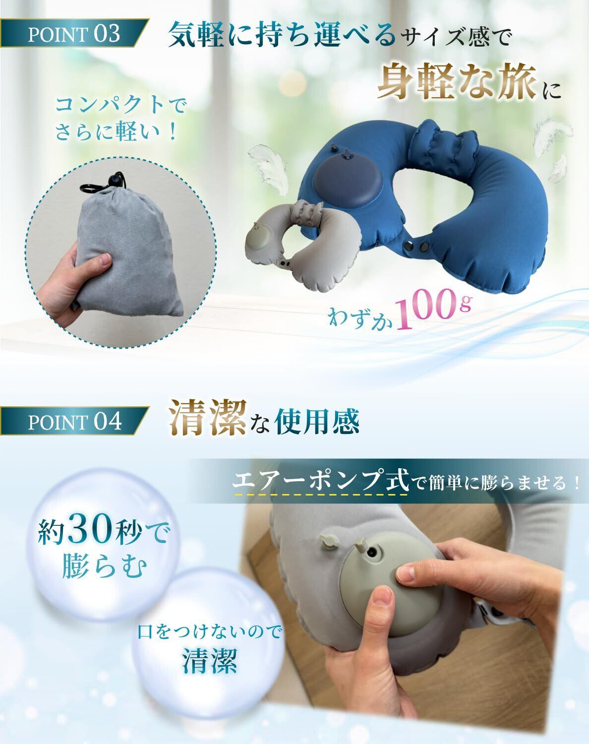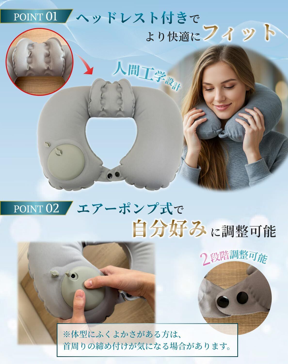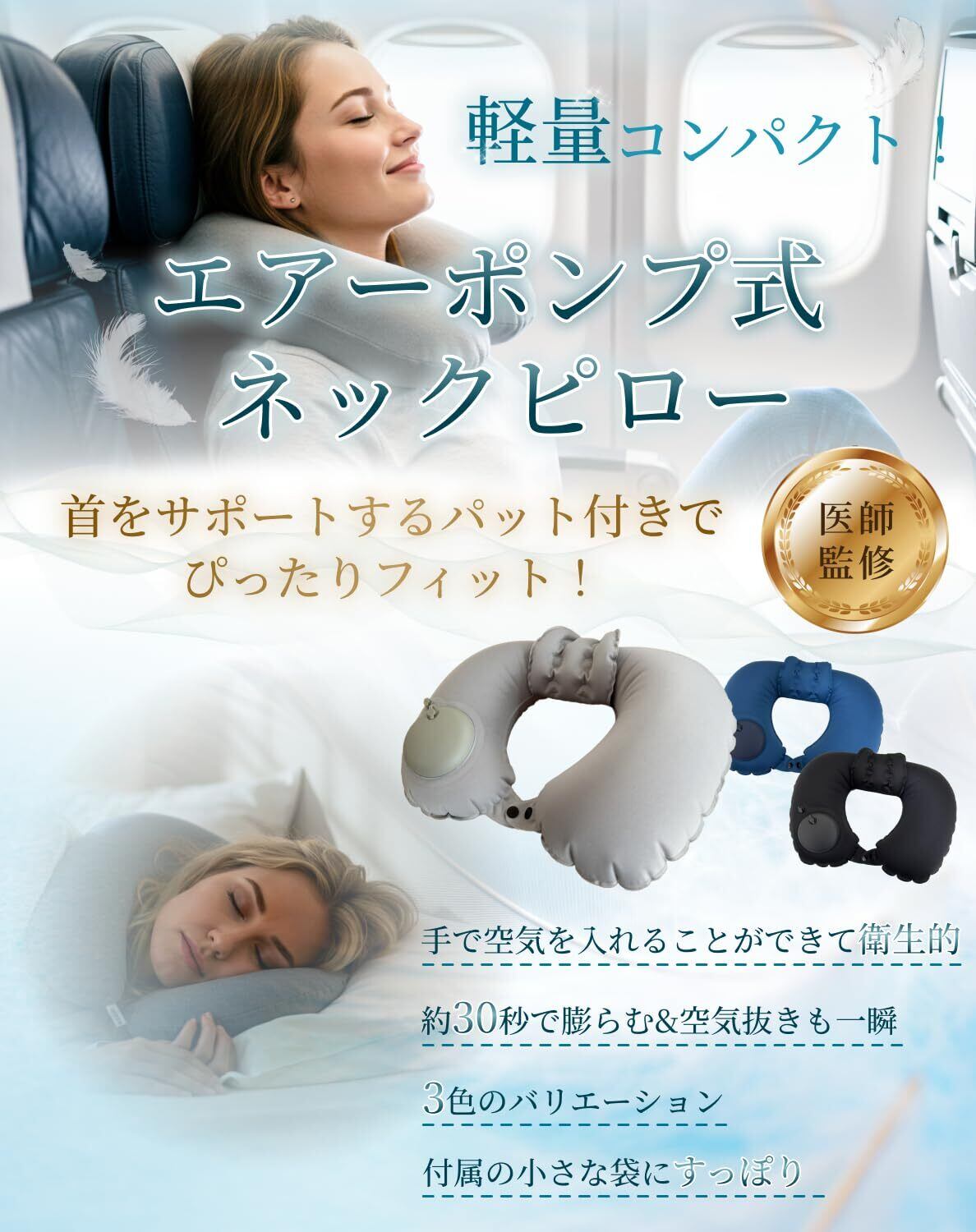 【医師監修x人間工学設計で快適フィット】 医師監修の高品質なネックピロー! ヘッドレスト付きで首や頭をしっかり支え、長時間の移動やデスクワークでも自然な姿勢をキープするエアーネックピローです。また、飛行機・新幹線・バス・職場・自宅での仮眠に最適で、大切な休息時間をもっと快適にサポートします。 【エアーポンプ式で簡単空気調整】 わずか30秒で膨らみ、空気抜きも一瞬! 口をつけずに膨らませるから衛生的です。 また、自分好みの硬さに調整可能で最高のフィット感を実現します。 【超軽量xコンパクトなトラベルピロー】 重さわずか100gの驚きの超軽量設計! 付属の専用袋にすっぽり収まり、荷物の邪魔にならないので、いつでもどこでも快適な休息が可能です。 旅行や出張の荷物もかさばらず、携帯枕としても大活躍です。 【清潔で快適な使用感】 長時間使用しても蒸れにくく、さらっと快適な使い心地をサポート! 高弾性ナイロン生地で、しなやかな肌触りです。 優れた通気性でムレにくく、オールシーズン快適に使用出来ます。 【6ヶ月の安心付き】 万が一初期不良があった場合は、交換・返品・返金対応いたしますので、安心してご購入ください。