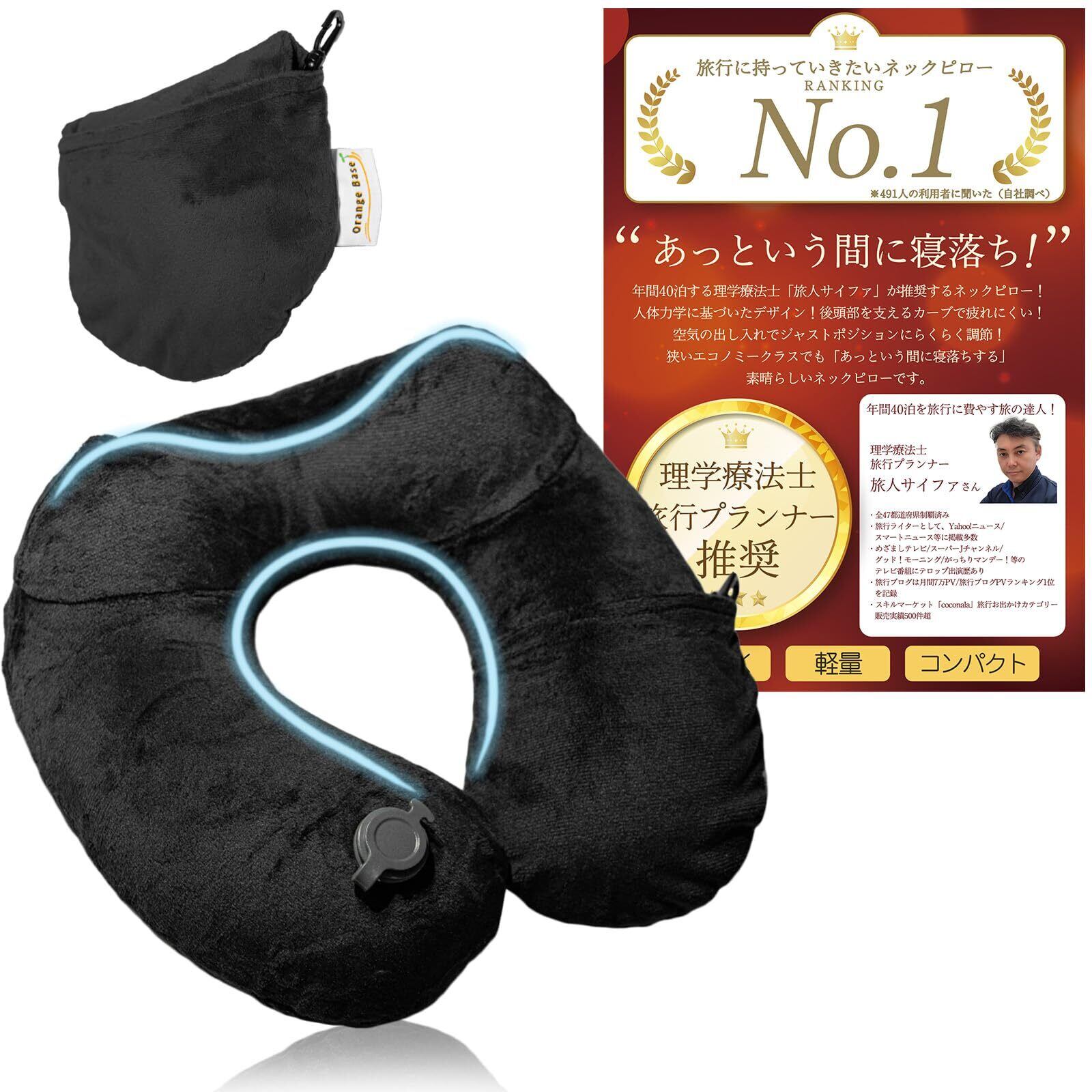 旅行プランナー 理学療法士推薦 Orange Base ネックピロー 洗濯OK 旅行 超軽量 携帯枕 あっという間に寝落ちする エアー型 睡眠 休息 neck pillow 人間工学 飛行機 コンパクト ブラック