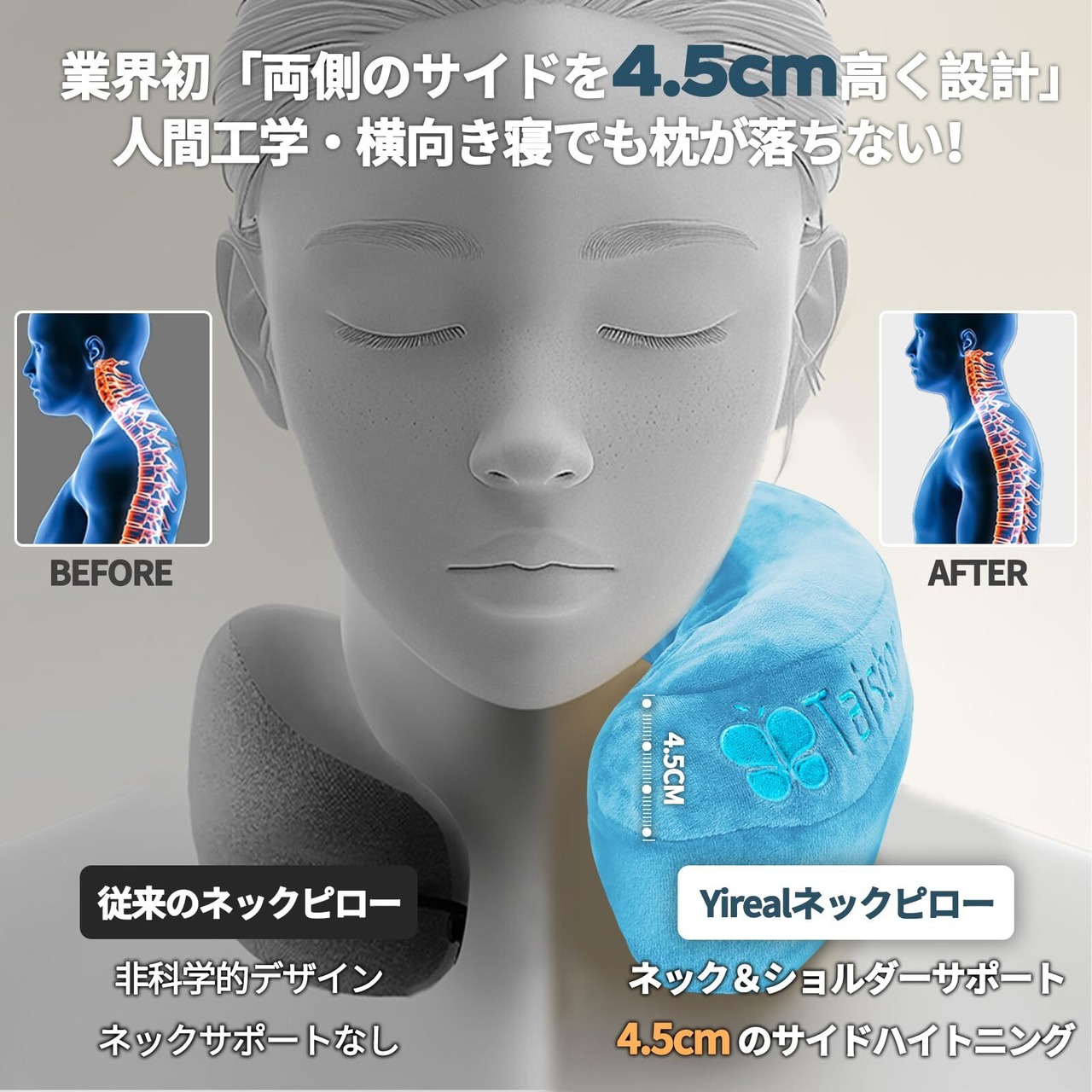 【業界初の立体サポート構造 、横向き寝革命】佐藤チームが200,000件のユーザーのフィードバックを解析して完成した「デュアルガードシステム」Yireal首枕。❶ ▼業界初サイドを4.5cm高く設計▼効果的に首を支え、横向きに寝る際の不快感を減少させます。横向き寝でも枕が落ちないです。側頭部を包み込むように支え、揺れる車内でも頭部を安定保持します。❷ ▼業界初フラットバック設計▼首の後ろが垂れ下がったり、押し上げられたりしがちな市販の製品とは異なり、Yireal首枕のバックネックサポートエリアは、背もたれやシートにぴったりフィットするフラットなデザインで、背もたれとの隙間を完全解消します。首が前に傾くのを防ぎ、首の後ろが垂れ下がることによる不快感を避け、首や背骨への負担を軽減します。