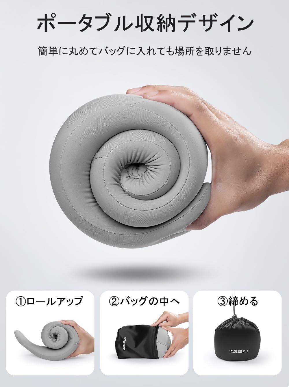 【簡単に収納でき、軽量かつ携帯に便利です】ネックピロー本体(カバー付き)、持ち運びに便利な軽量収納バッグ付き。収納袋には袋の口を締める用ボタンが付いており、より効果的にスペースを節約し、枕面を清潔に保つために。約390g軽量かつ携帯に便利、どこにでも持ち歩きたい一品です。