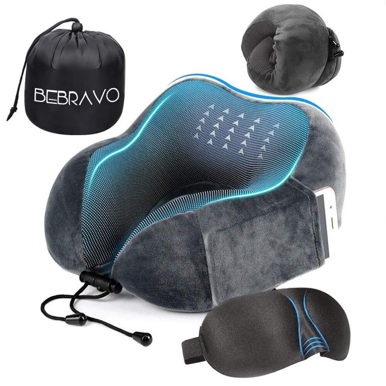 ネックピロー 飛行機 低反発 U型まくら BeBravo 旅行用 携帯枕 昼寝 首枕 コンパクト 通気性が良く 軽量 3Dアイマスク 収納袋付き グレー
