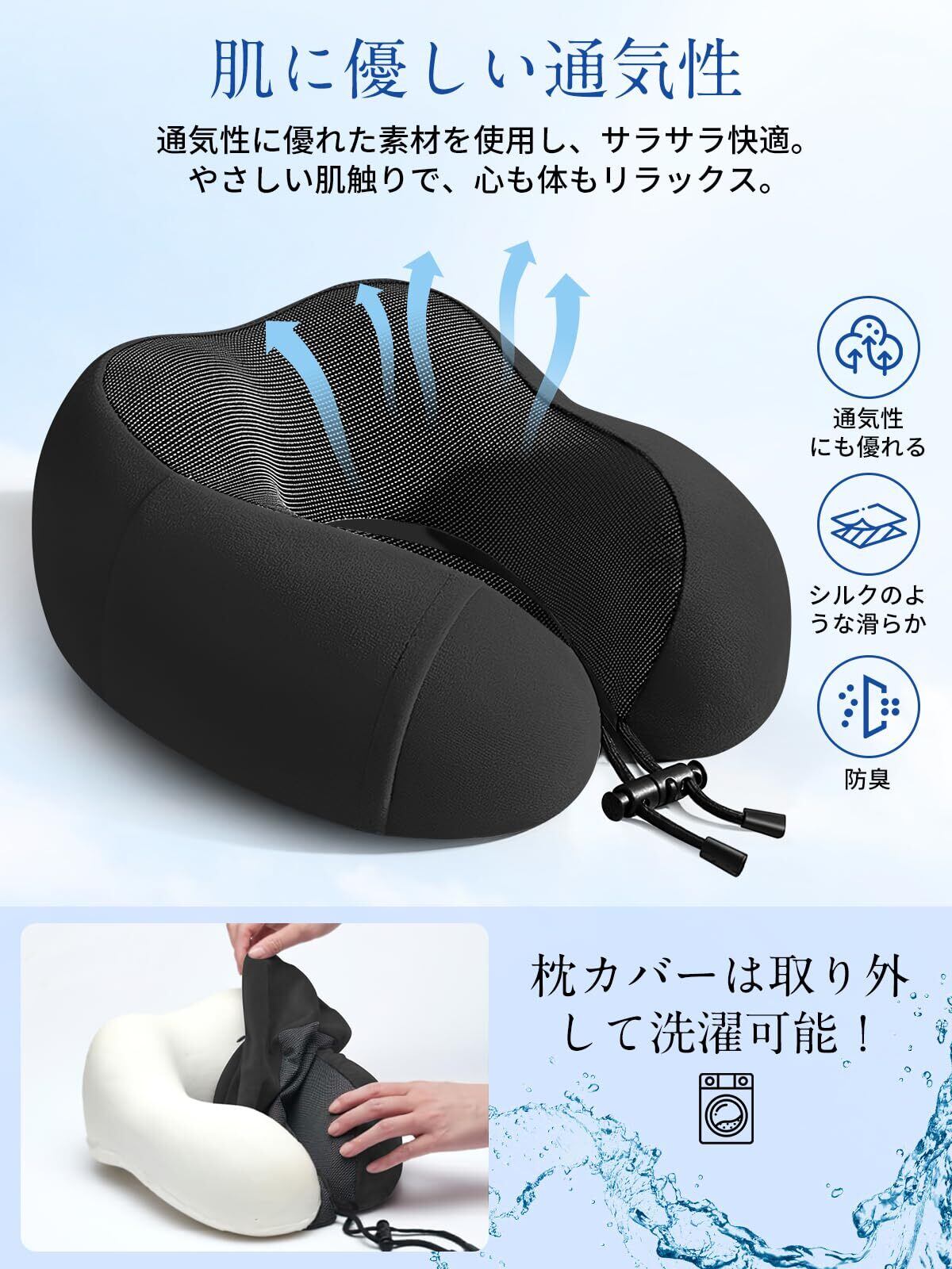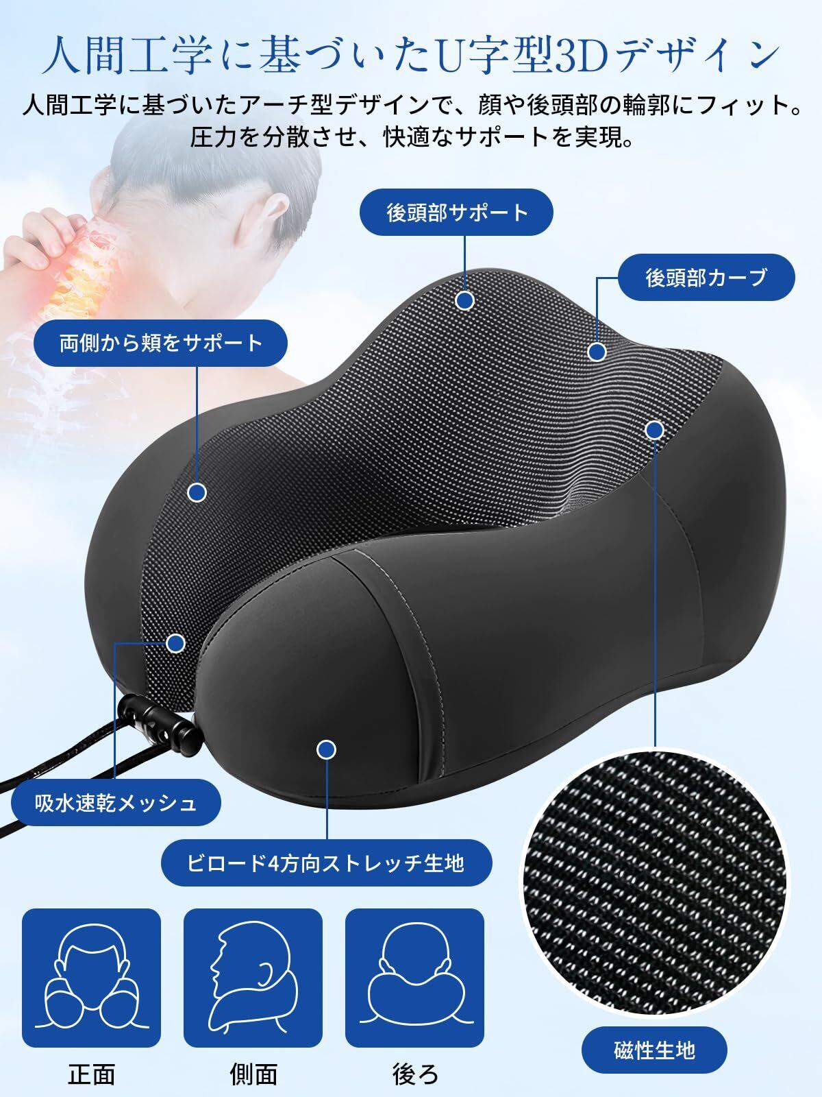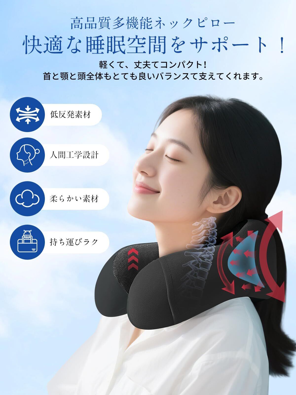 【人間工学に基づいた首サポートデザイン】U字型デザインが首の後ろと両側からしっかりとサポート。首のカーブにフィットし、左右に傾けても安定した支えと固定性を提供します。優れたクッション性で首と後頭部を支え、肩・脊椎・首への負担を効果的に軽減し、深い眠りへと導きます。さらに、調節可能なショルダーストラップが付いており、首周りに合わせてスムーズに調整可能です。