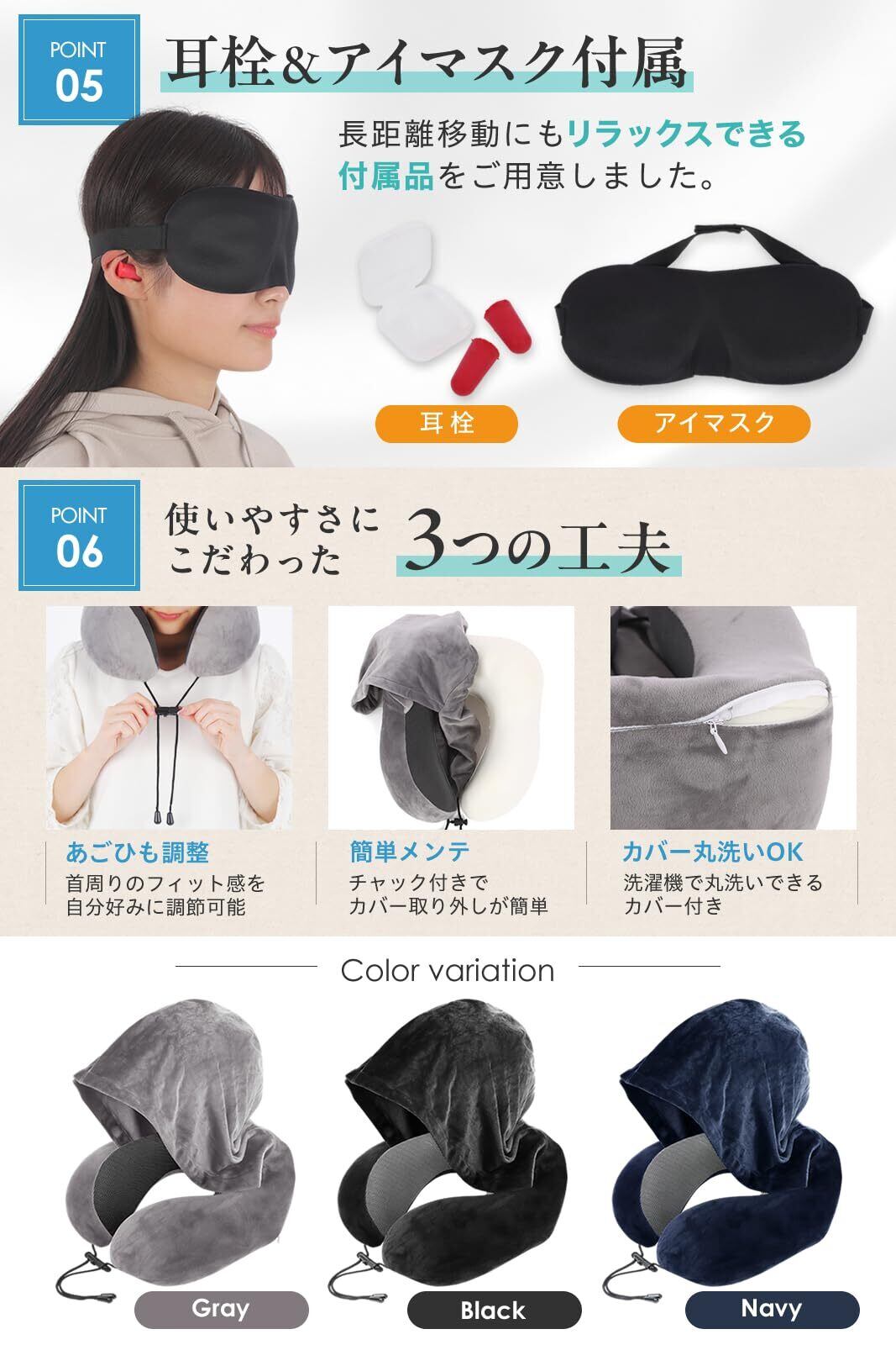 【コンパクト収納&便利な3点セット付き】 専用の収納袋でコンパクトに持ち運びOK!さらに耳栓・アイマスク付きで移動中の快適さをアップ。飛行機・新幹線・バス・車・オフィスなど、あらゆるシーンで活躍します。