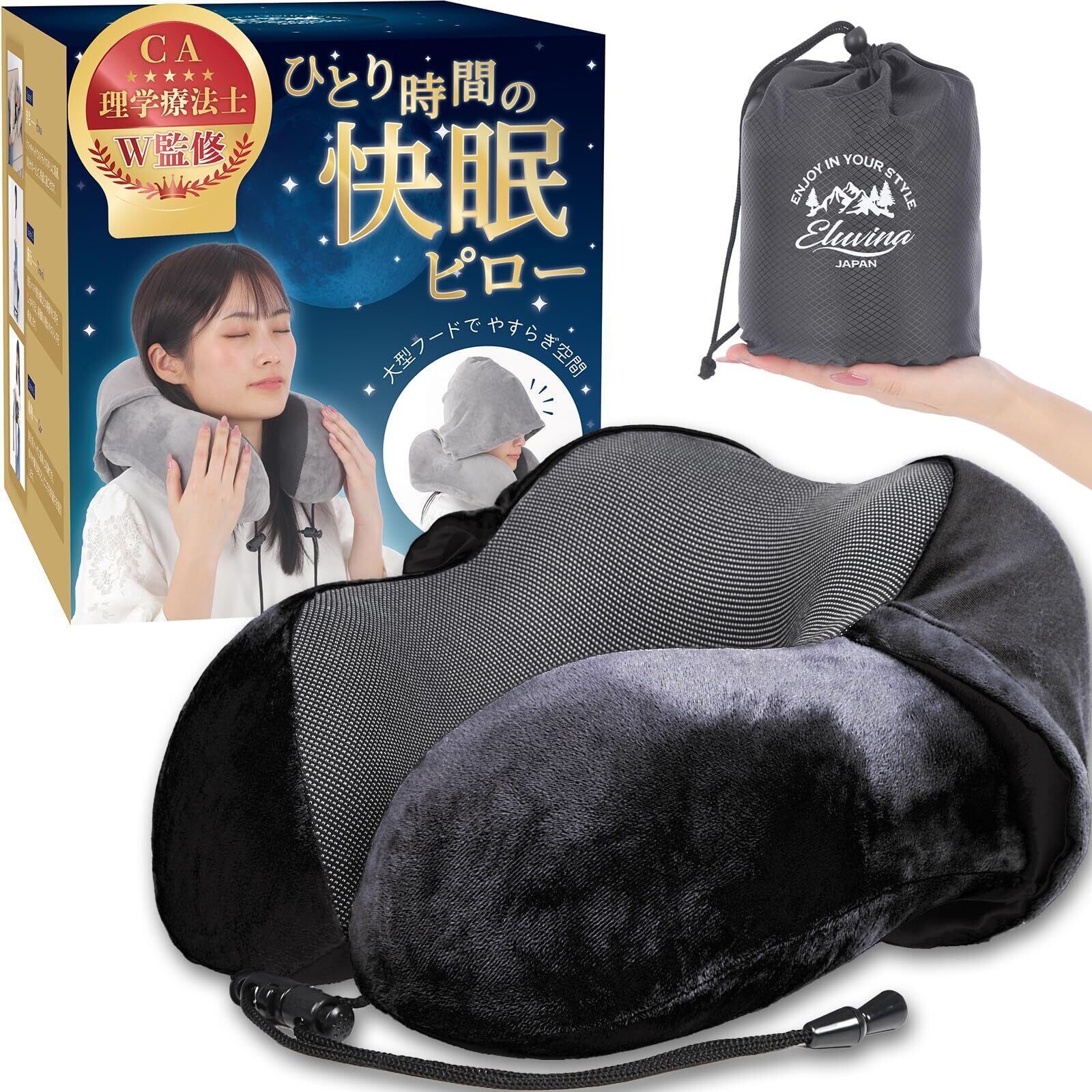 【特別価格】【理学療法士&CA監修】ネックピロー 低反発 トラベルピロー 飛行機 旅行用 首枕 丸洗い可 3点セット(耳栓・アイマスク・収納袋)フード付き 携帯枕 抗菌防臭 通気性 あご紐調整可(ブラック)