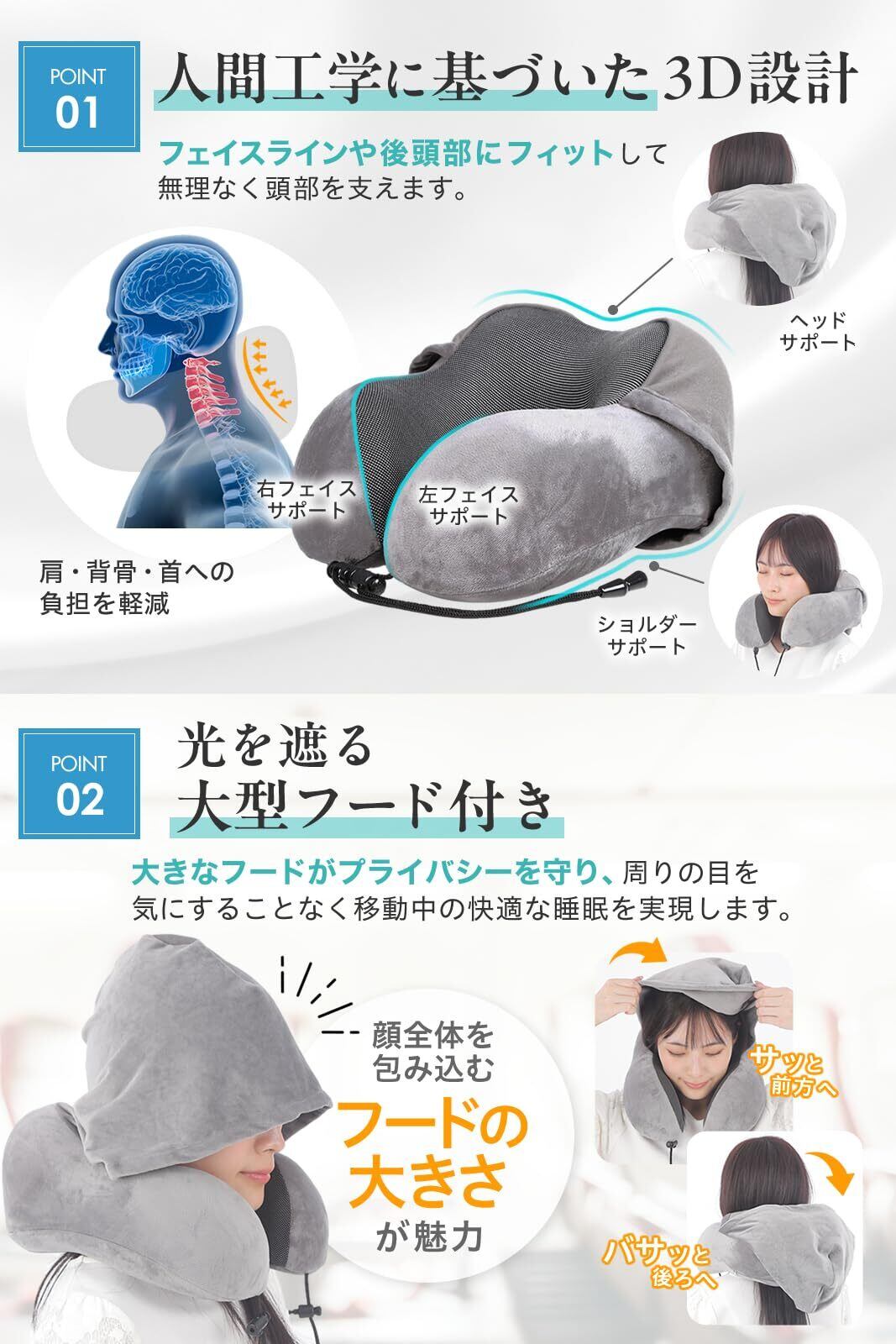 【取り外し可能なフードで快眠サポート】 大型フード付きで、機内や移動中の光をカット。人目を気にせずリラックスでき、睡眠の質を向上させます。(フードは取り外し可能)