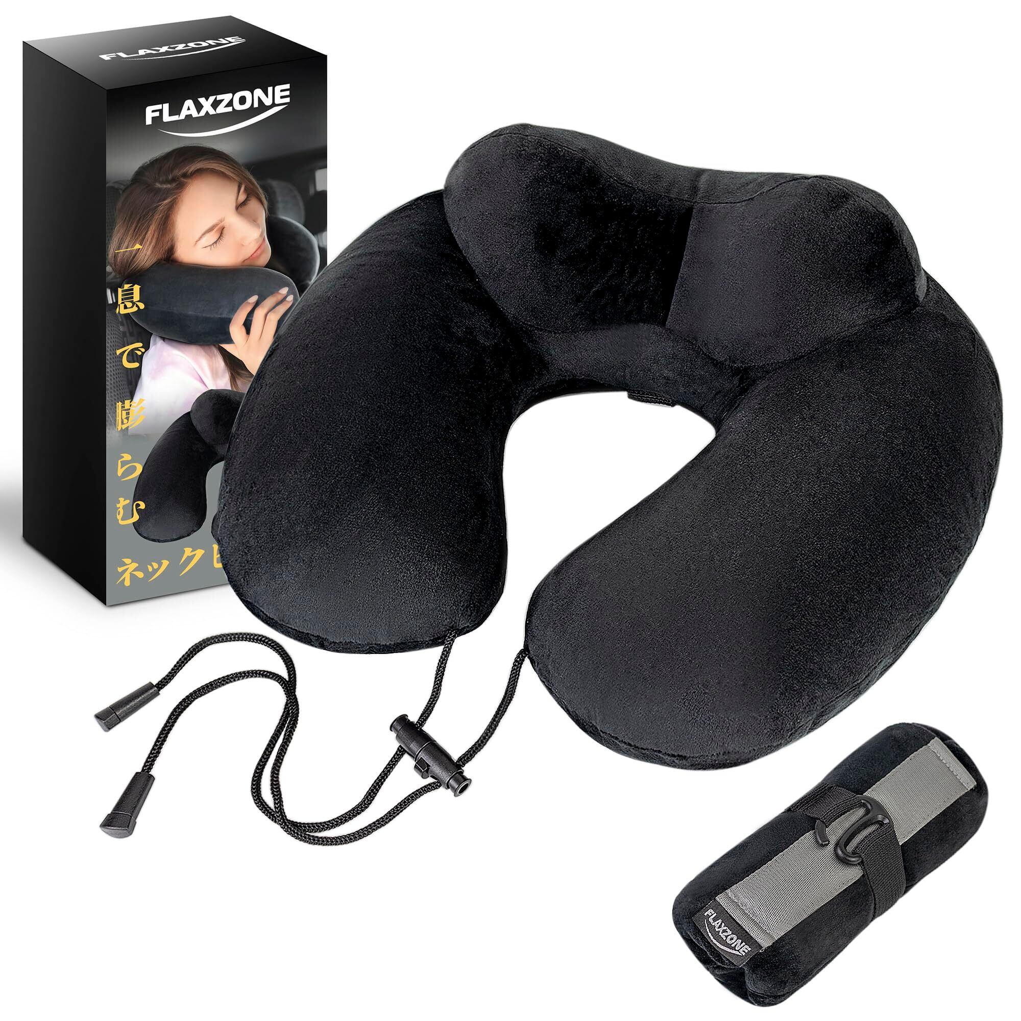 【限定セール】2025年モデル ネックピロー 飛行機用 空気で簡単膨らむ 首枕 超軽量&コンパクト収納 洗えるカバー 飛行機・新 幹線・オフィス・車用 携帯枕|男女兼用 旅行グッズ FLAXZONE 首枕, ブラック