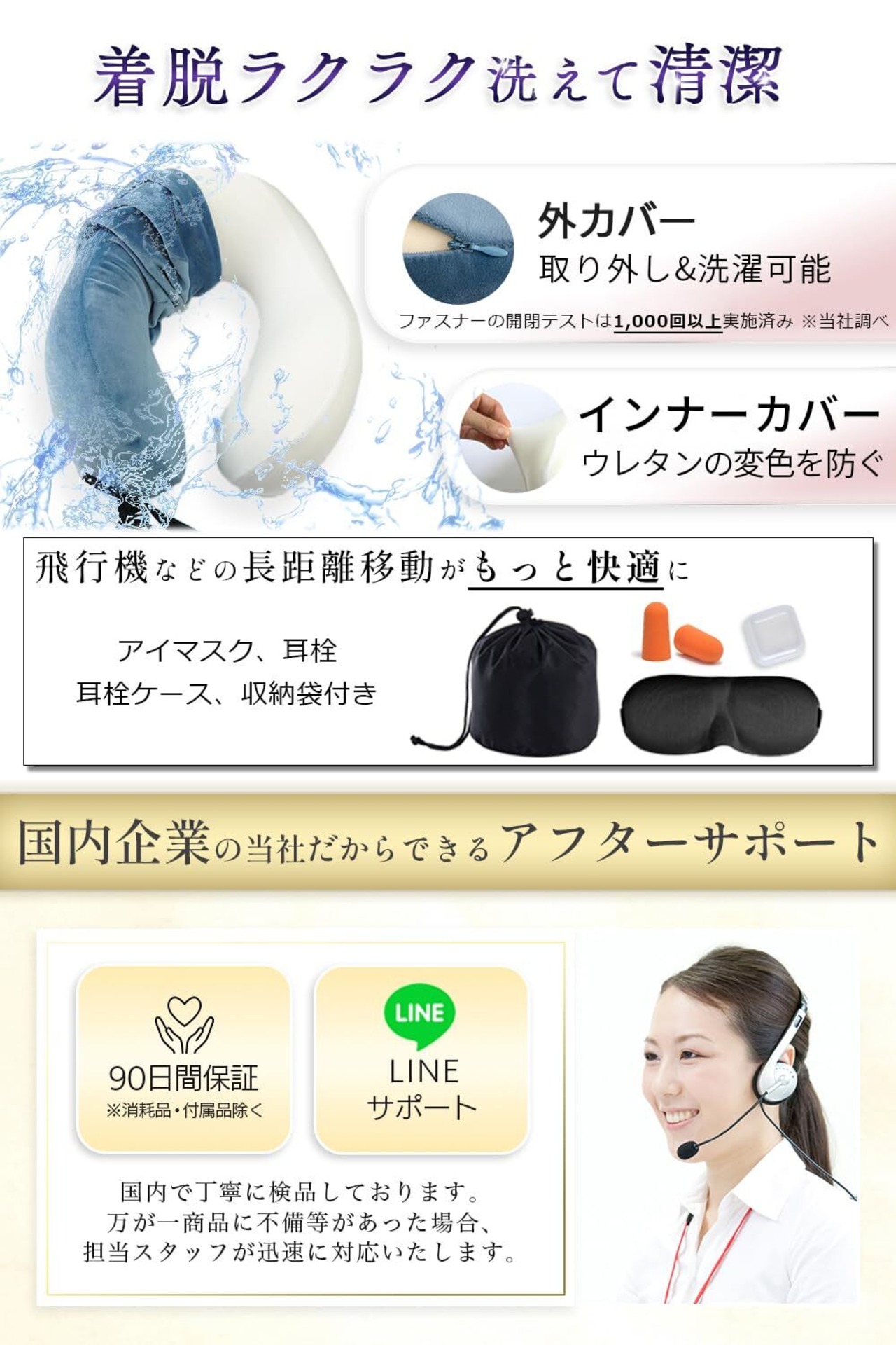【洗濯可能でいつでも清潔に】このネックピローは取り出して洗濯可能な外カバー、ウレタンの変色を防ぐためのインナーカバーが付いており、いつでも清潔にご使用いただけます。さらに、ネックピローのファスナーについて開閉テストを1,000回以上実施済み、ストレスなくご使用いただけます。