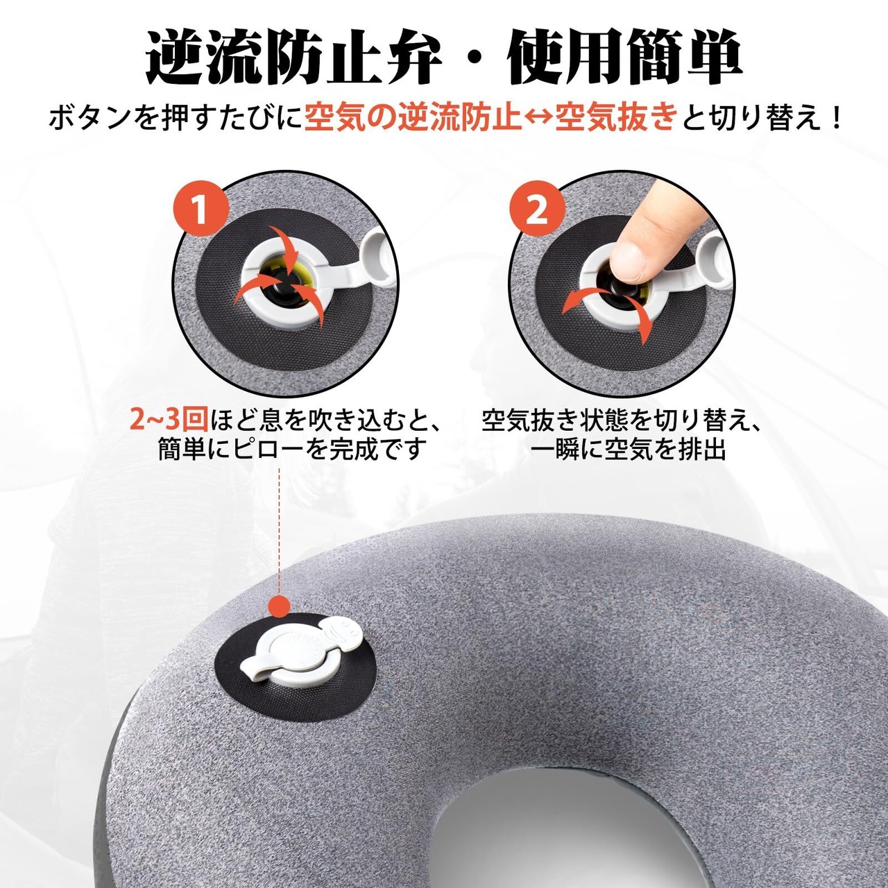 【寝心地良い・サイズ感調節可能】① 人間工学に基づき、首周りをしっかりサポートする定番スタイル・U字型エアーネックピローです。頭がサイドや後ろに倒れるのを防げます。長距離移動におすすめ。② サイズ調整ボタン付き、体型に合わせて自分好みのサイズ感を調整できます。③ 空気弁を半押しにして空気量の加減により、好みの硬さに調節できます。