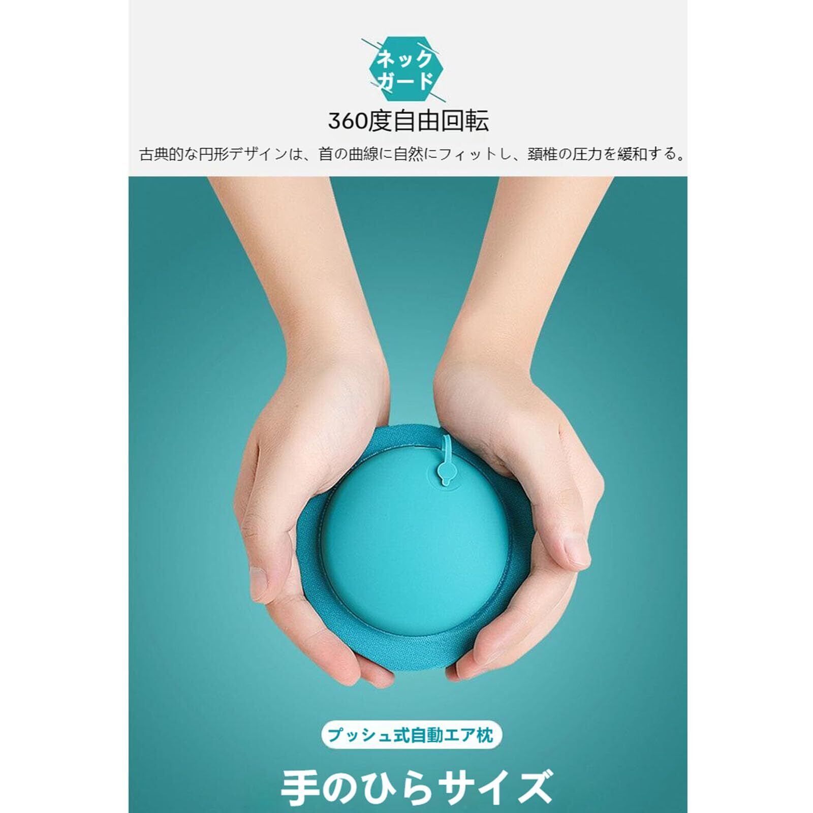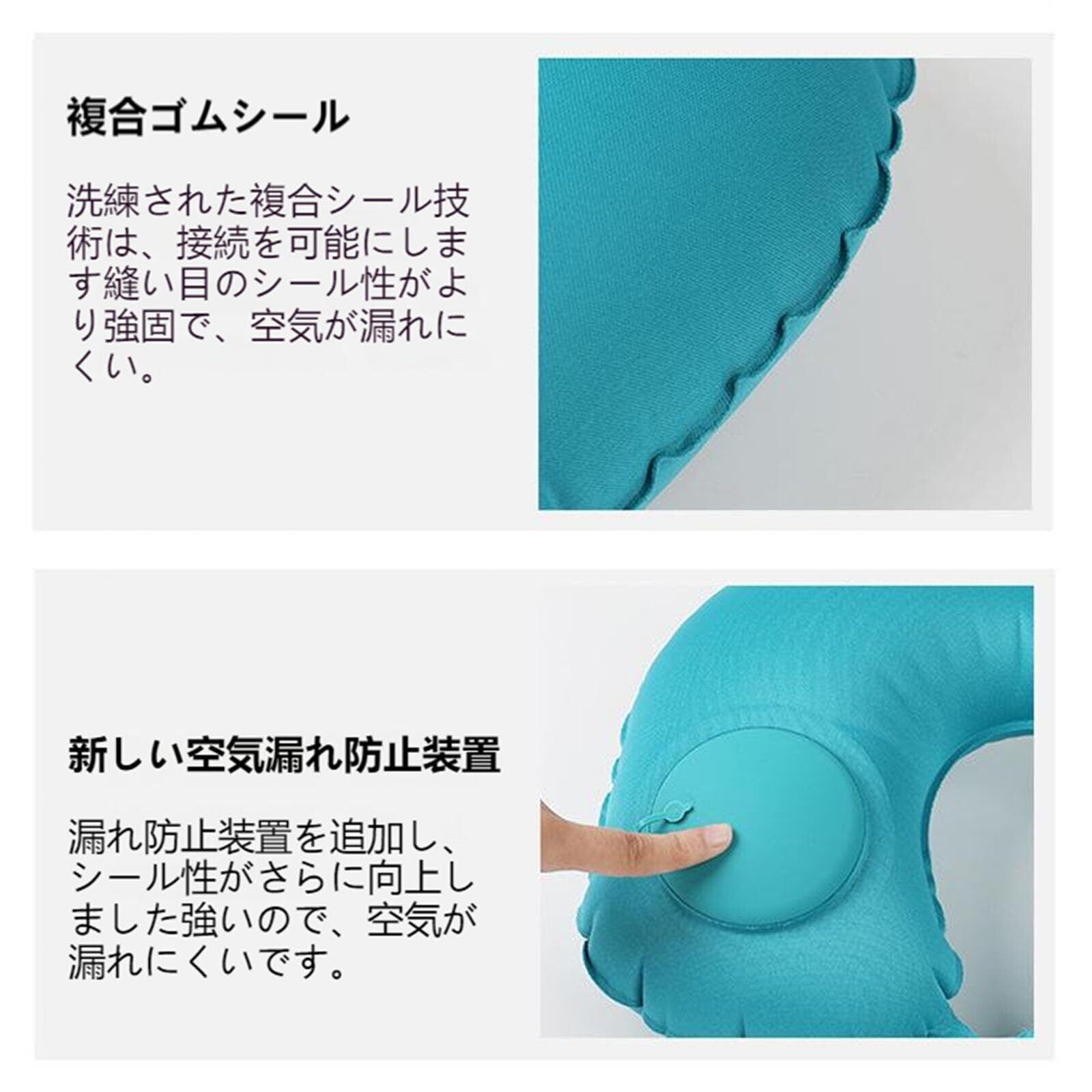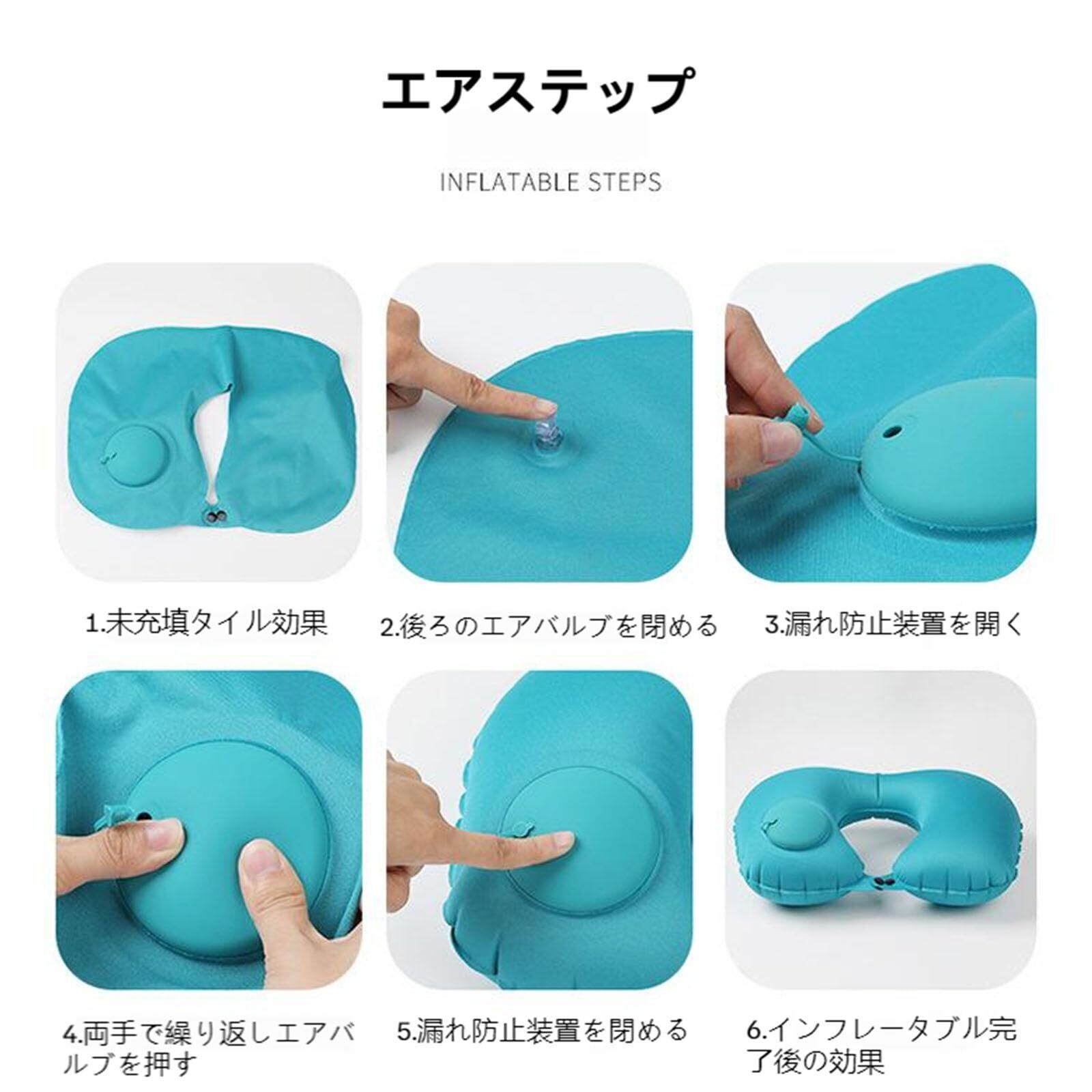 【使用方法】1.枕を平らに寝かせます。 2.背中の排出バルブに蓋をします。 3.漏れ防止装置をオンにします。 4.膨張バルブを両手で繰り返し押します。 5.漏れ防止装置を閉じます。 使用後:6.使用後、一方向弁を絞って空気を抜きます。 7.空気を抜いた後、カバーを外し、付属の収納袋に入れます。